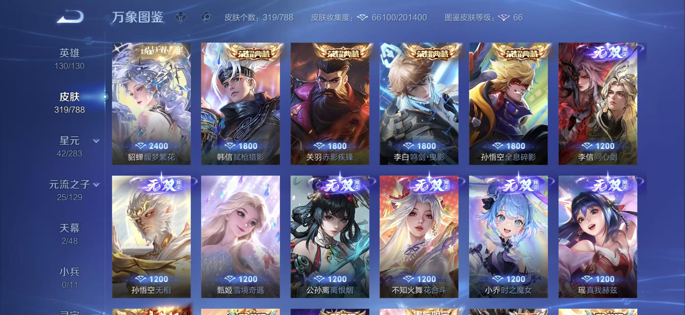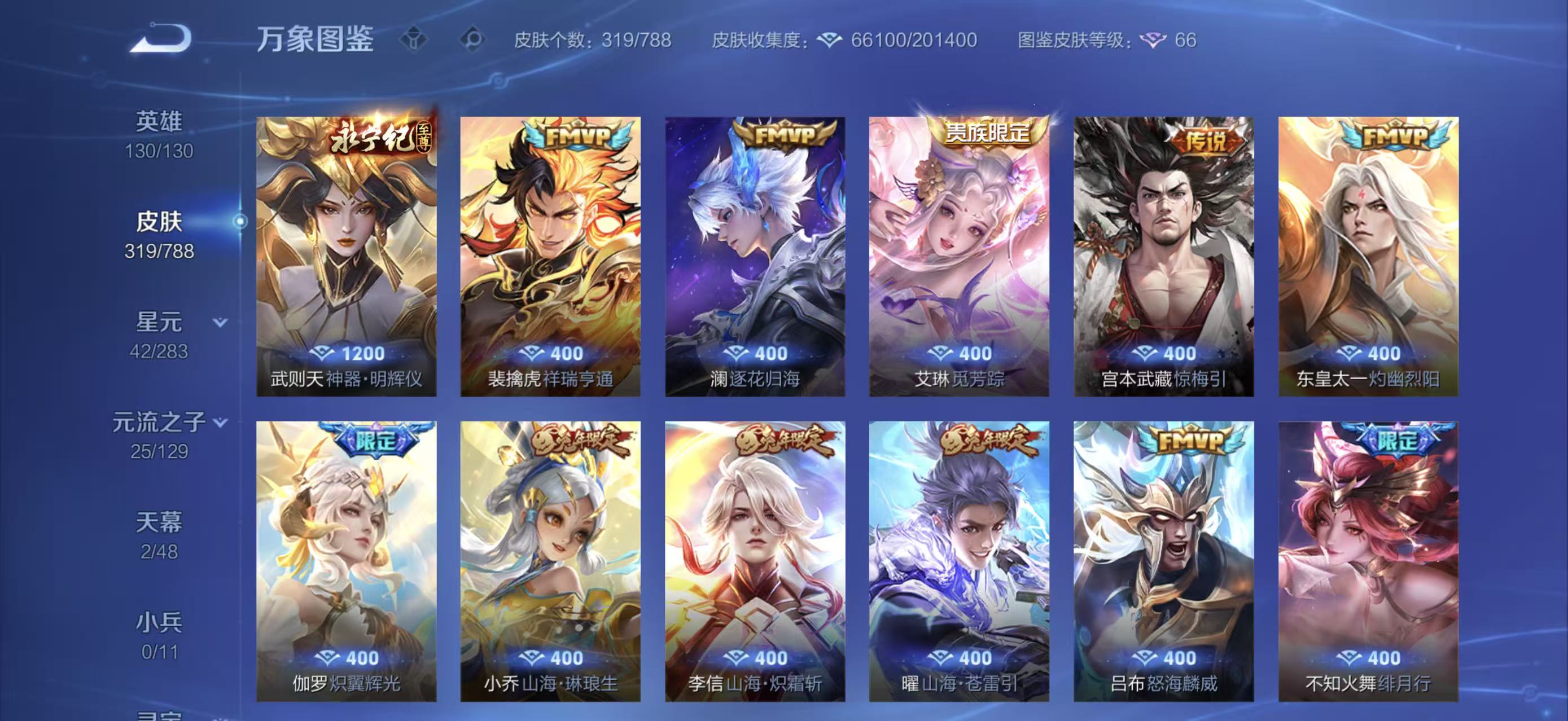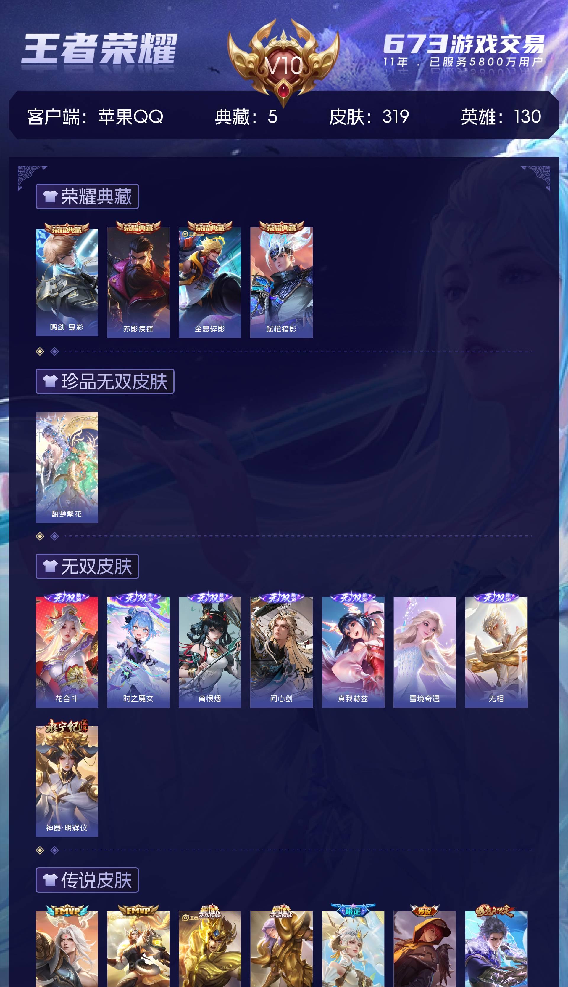 V10 皮肤319 英雄130 至尊星耀 荣耀典藏5 珍品无双1 无双皮肤8 传说38