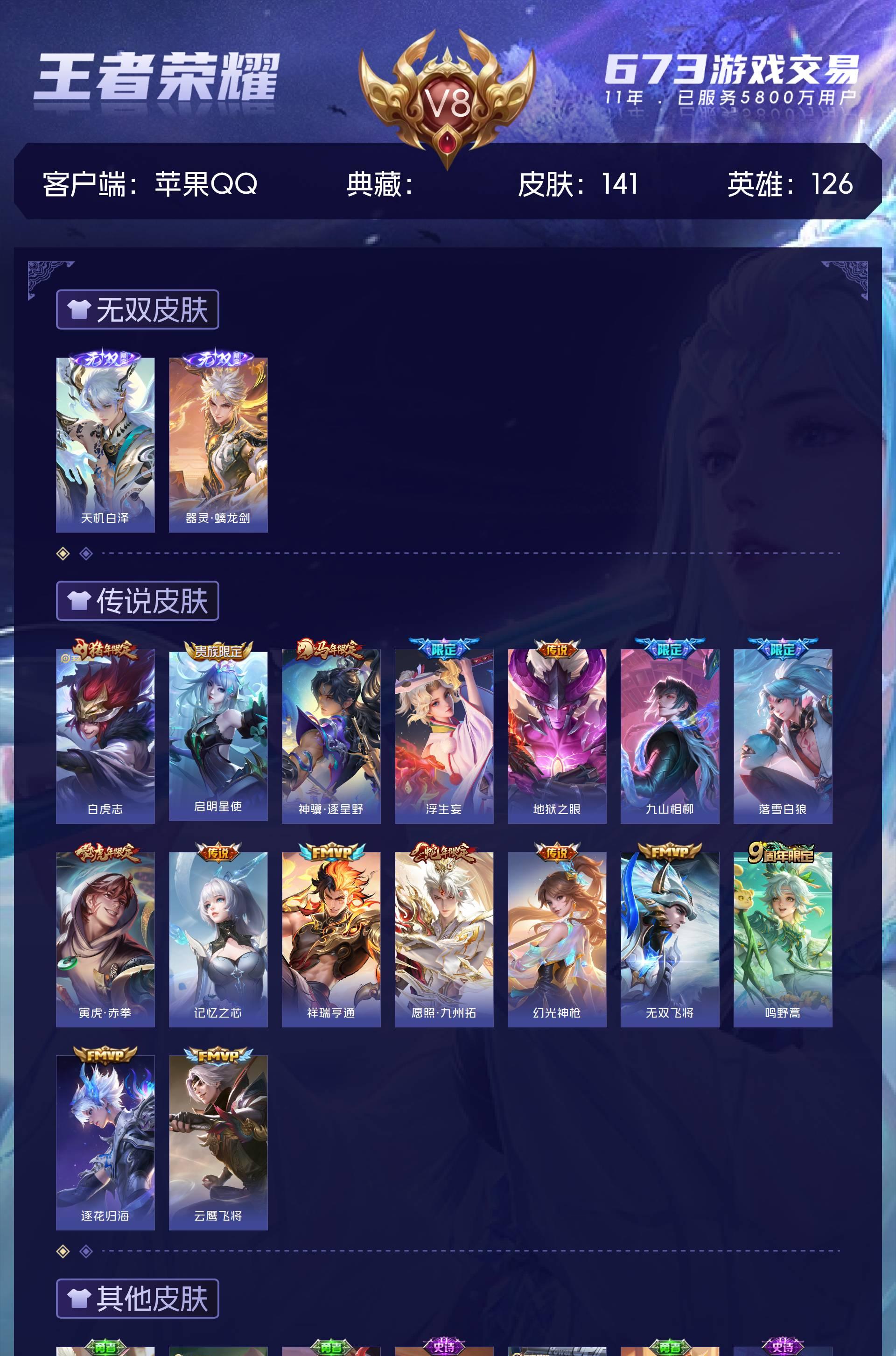 V8 皮肤141 英雄126 至尊星耀 无双皮肤2 传说16