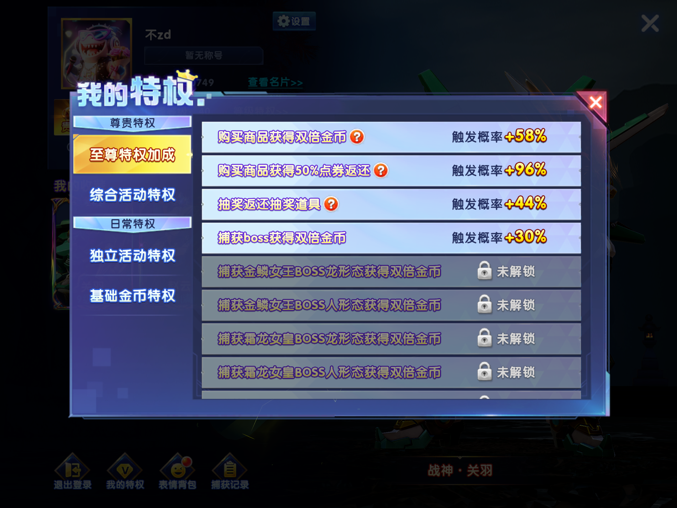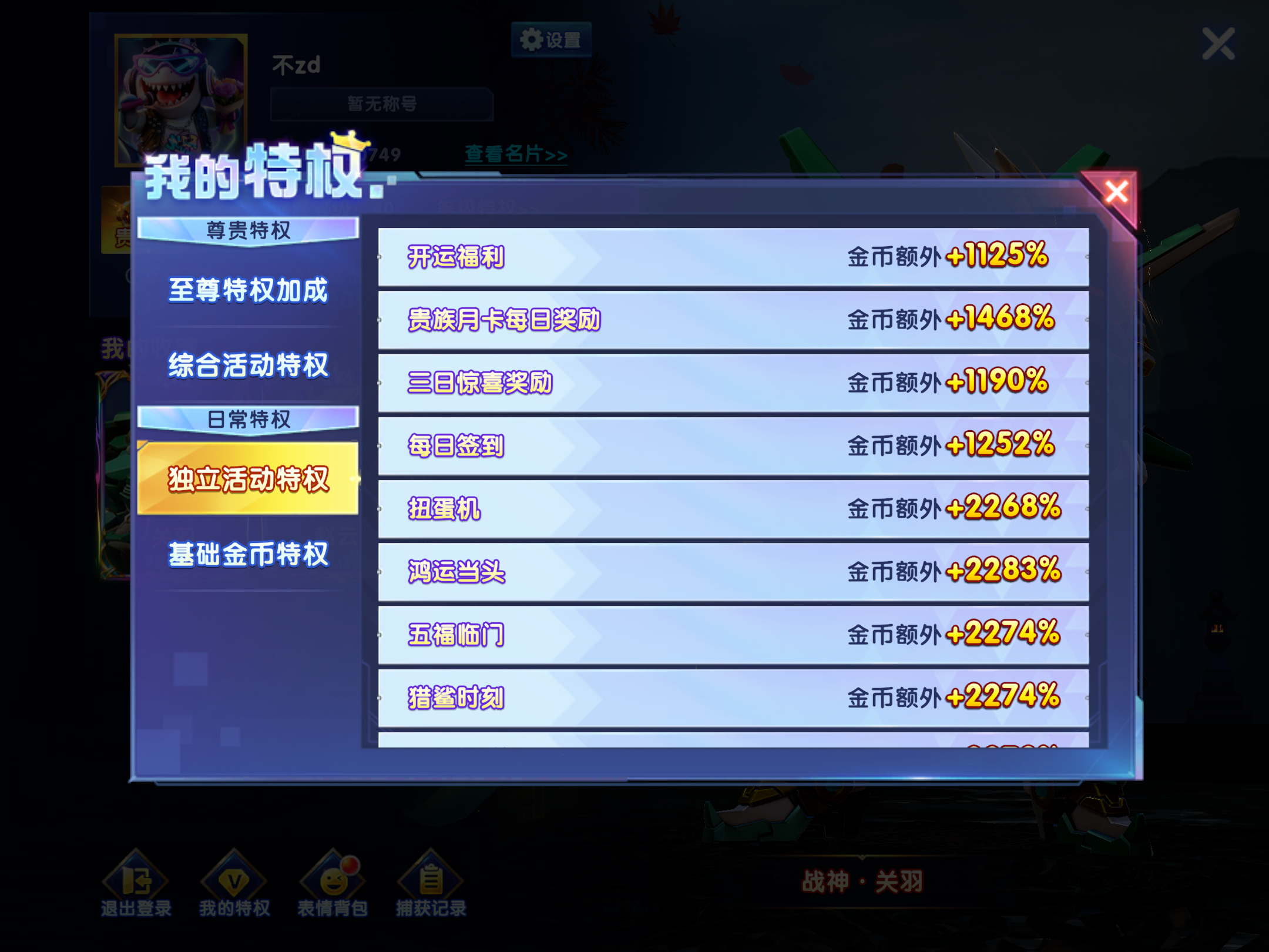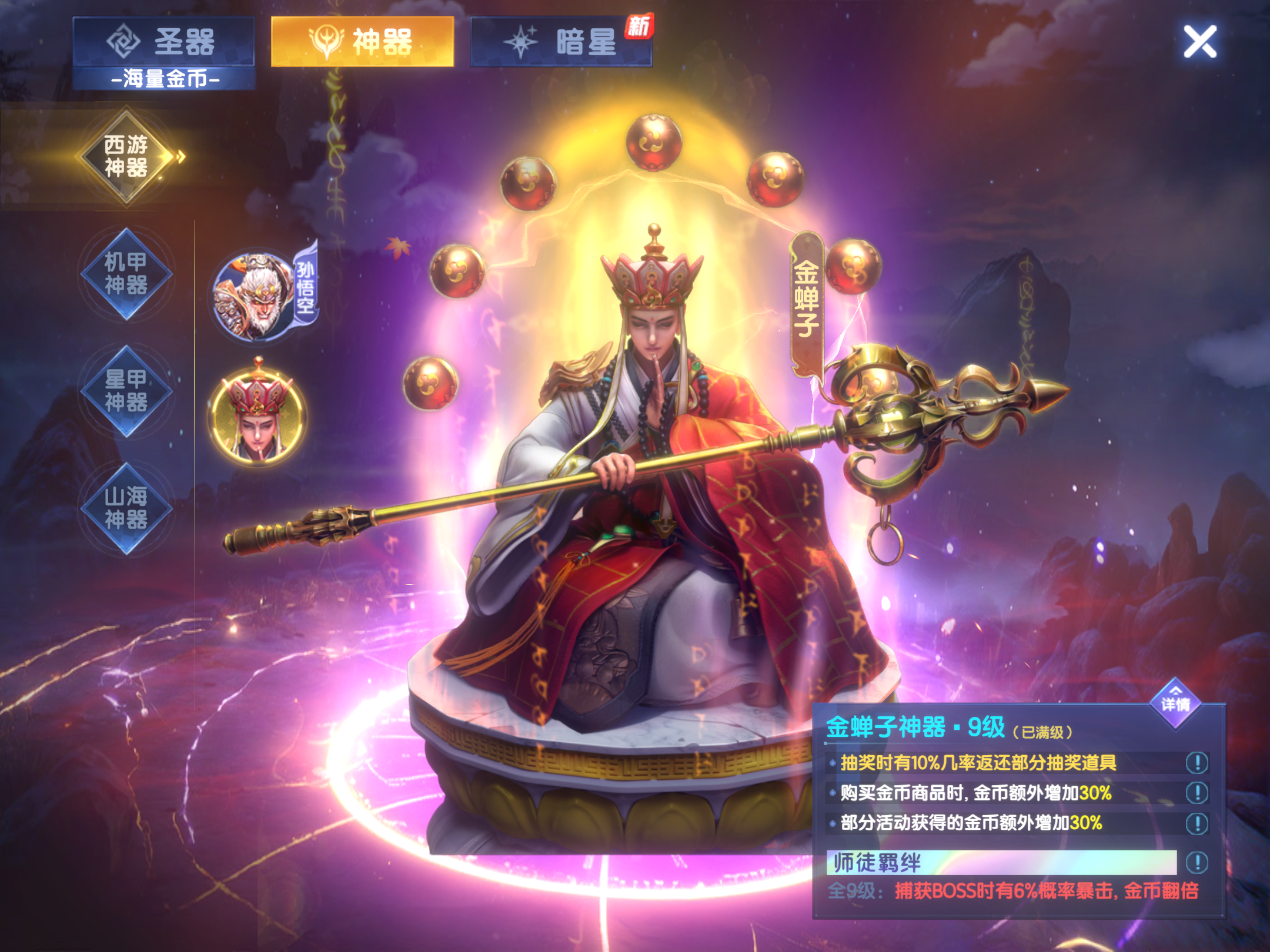 贵族25(充值50万以上)|双羁绊满(师徒+机甲,BOSS暴击6%翻倍)|全9级神器(孙悟空/金蝉子等)|购商品金币+2264%|10级关羽/赵云/贾诩/圣天使|最高炮倍5万亿|捕获金鳞女王13200