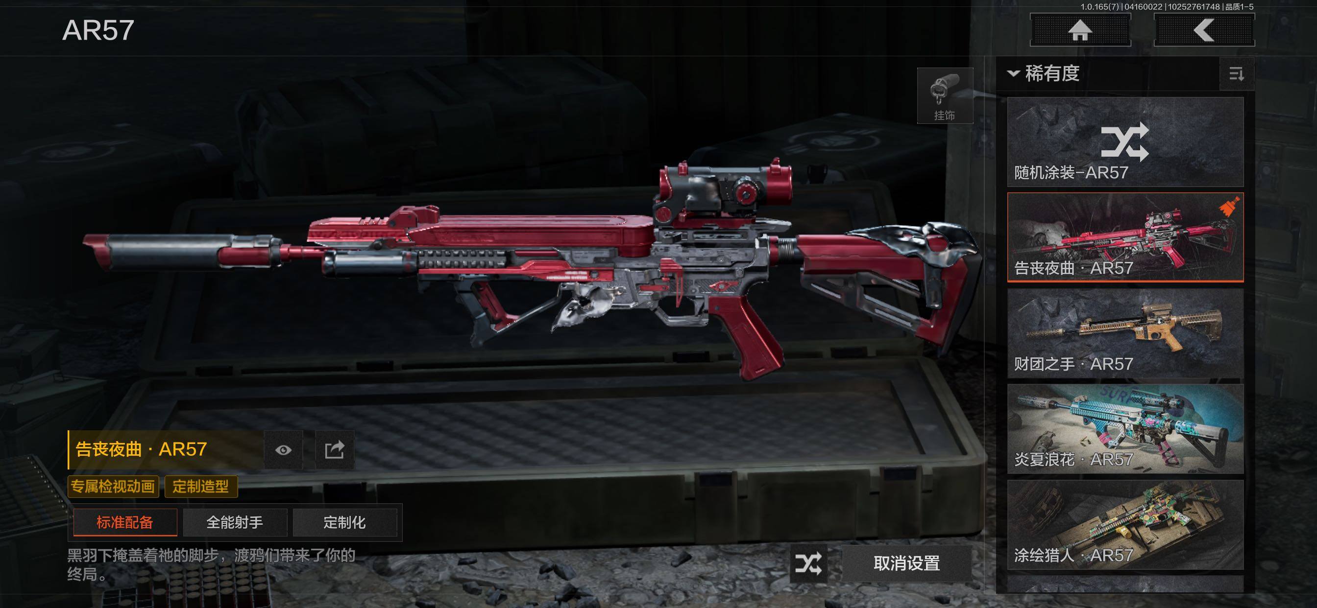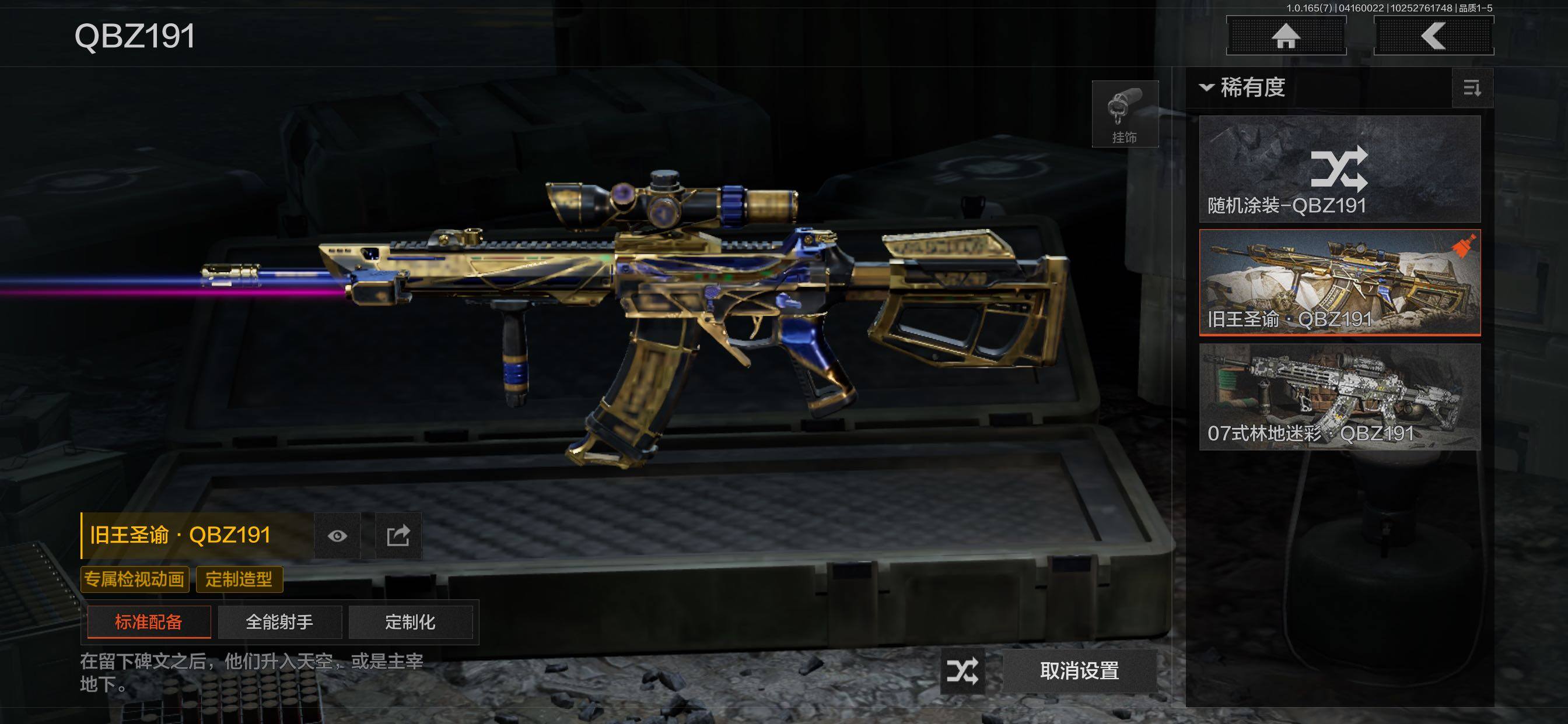 【金色枪皮】:林中人FAL,镀火熔金·H416,告丧夜曲·AR57,旧王圣·VSS,旧王圣谕·QBZ191,