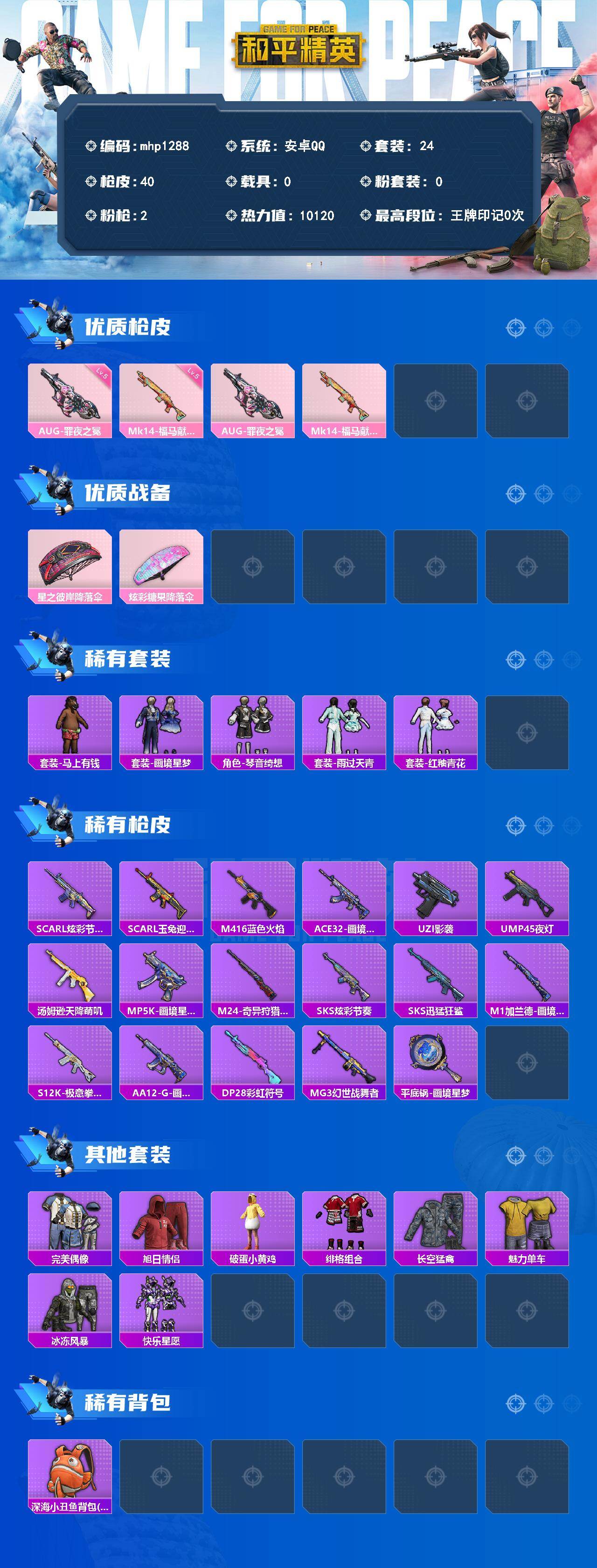 【mhp1288】安卓 手Q-0粉装-2特效枪-0载具-0粉色飞行器-10120热力值-1王牌印记-24套装-40枪皮 地铁号