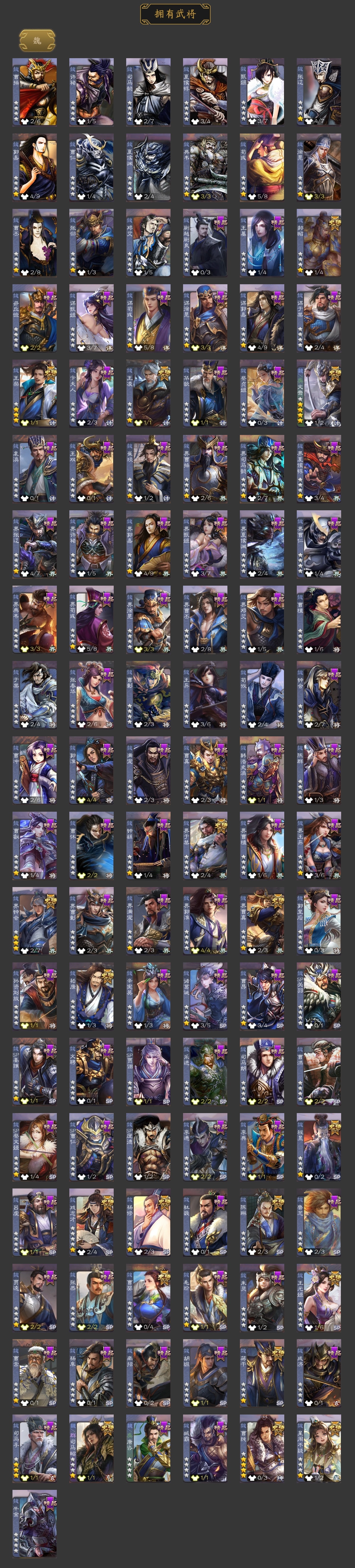 VIP等级: VIP12 官阶: 大将军 武将数量: 440 动态皮肤数量: 59 神将: 神甘宁,神郭嘉,神陆逊,神吕布,神孙策,神太史慈,神荀彧,神张辽,神赵云,神关羽,神吕蒙,神周瑜,神诸葛亮 魏国武将: 戏志才,曹纯,曹婴,陈琳,程昱,郝昭,嵇康,界曹真,界于禁,界钟会,魏-司马昭,王凌,王元姬,文鸯,杨修,王粲,唐咨-魏,张辽,SP蔡文姬,SP曹仁,SP关羽,SP贾诩,SP姜维,SP庞