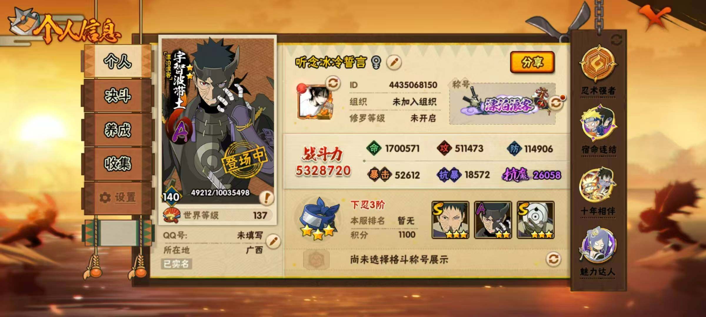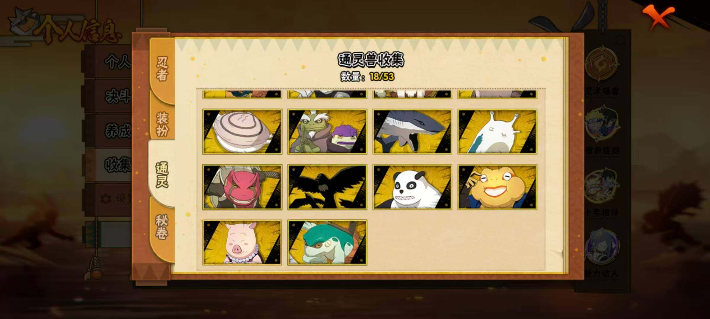 【S级忍者】:千手扉间「秽土转生」(3星),宇智波斑「秽土转生·解」(3星),宇智波带土「忍界大战」(3星),宇智波鼬「须佐能乎」(3星),旗木卡卡西「须佐能乎」(3星),千手柱间「木叶创立」(3星),自来也「舞之豪杰」(3星),波风水门(3星),漩涡鸣人「九喇嘛连结」(3星),佩恩「天道」(3星),宇智波佐助「永恒万花筒」(3星),宇智波斑 「白面具」(3星宇智