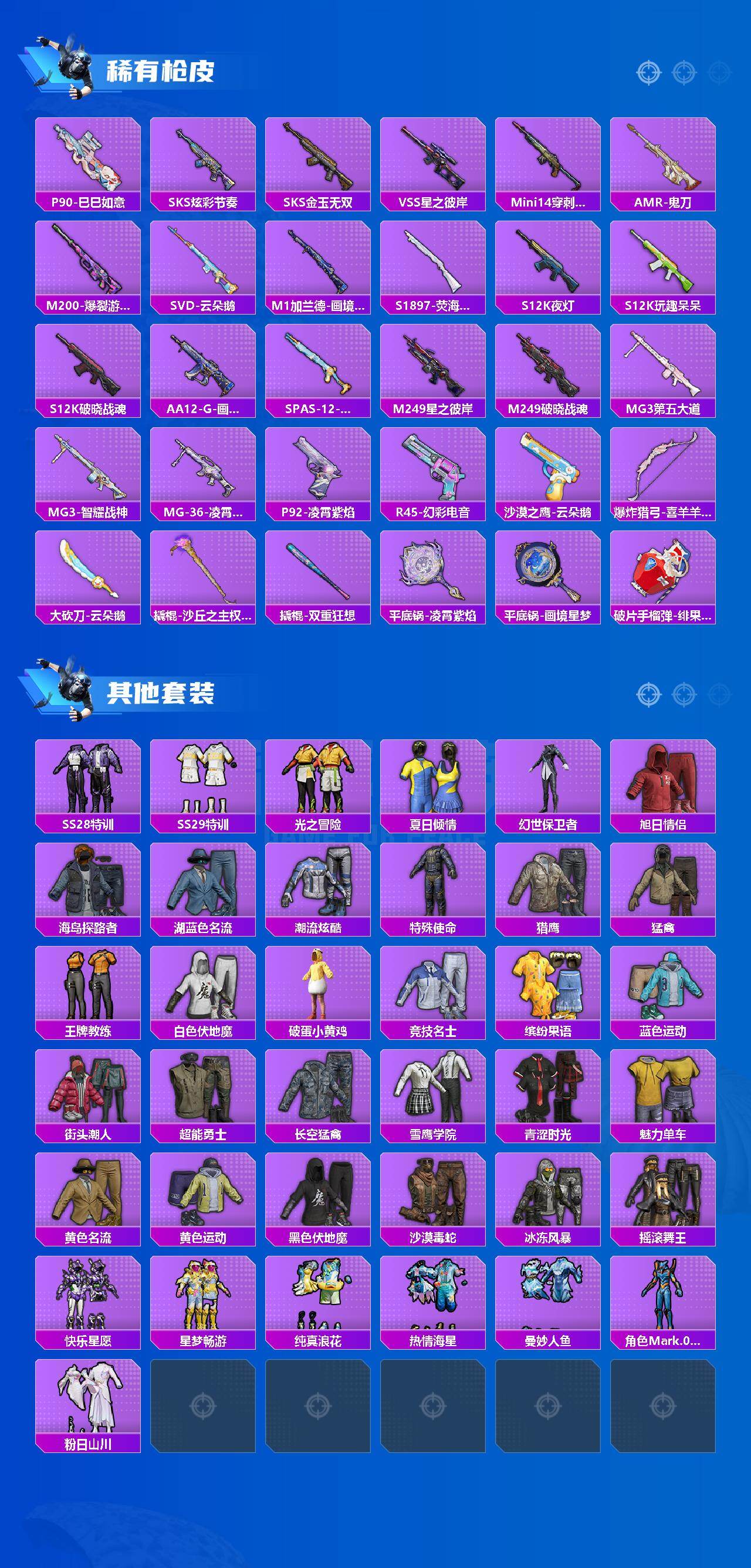 【粉色枪皮等级】:GROZA-镜光银凌(五级),AUG-星之彼岸(七级),AUG-暖羊咩咩(五级),UMP45-量子极限(五级),AKS-74U-森灵之息(五级),Kar98K-巳巳如意(五级),Mk14-甜梦熊击(五级),Mk14-福马献瑞(五级),DP-28
