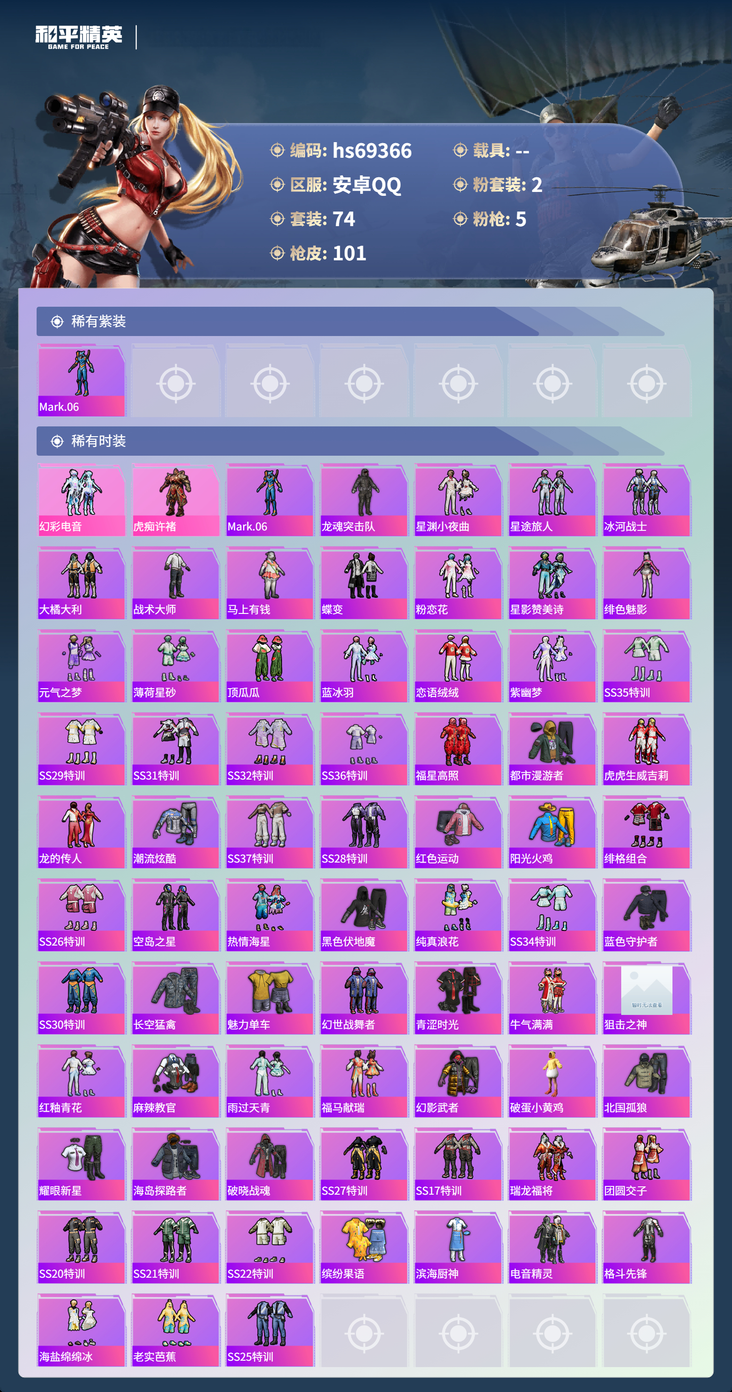 安卓手Q-1王牌印记-2粉装-5特效枪-29618热力值-74套