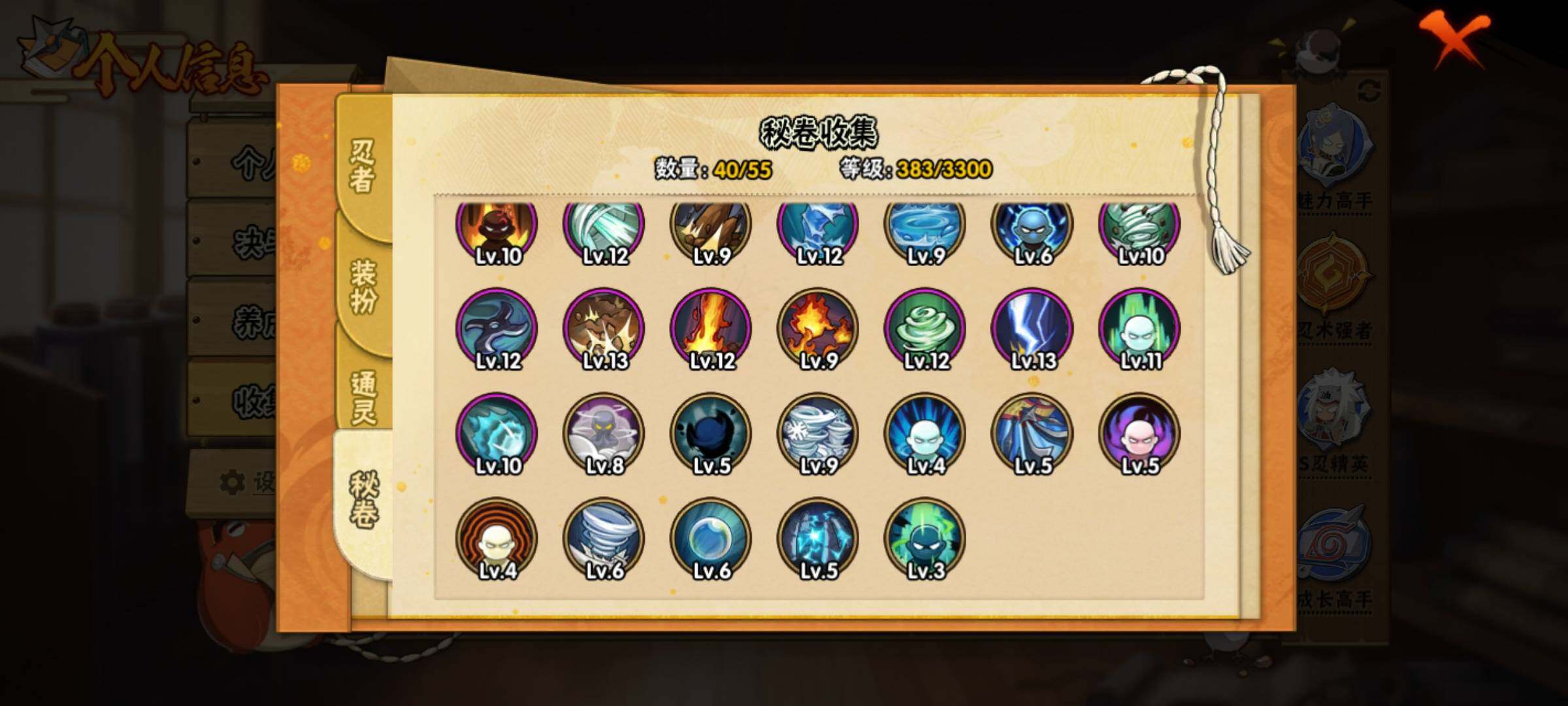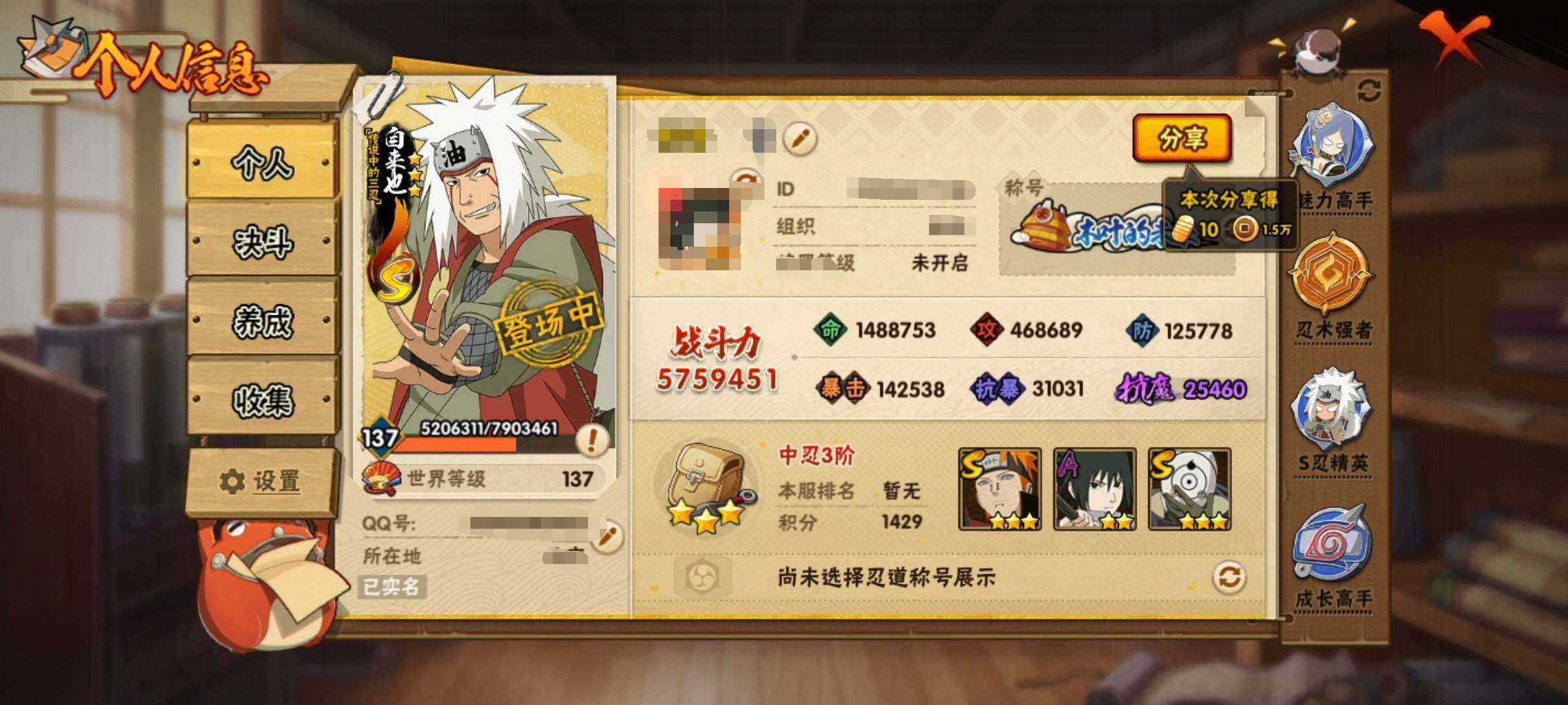 VIP等级V10/战力575W/S忍数量10/A忍数量26/4