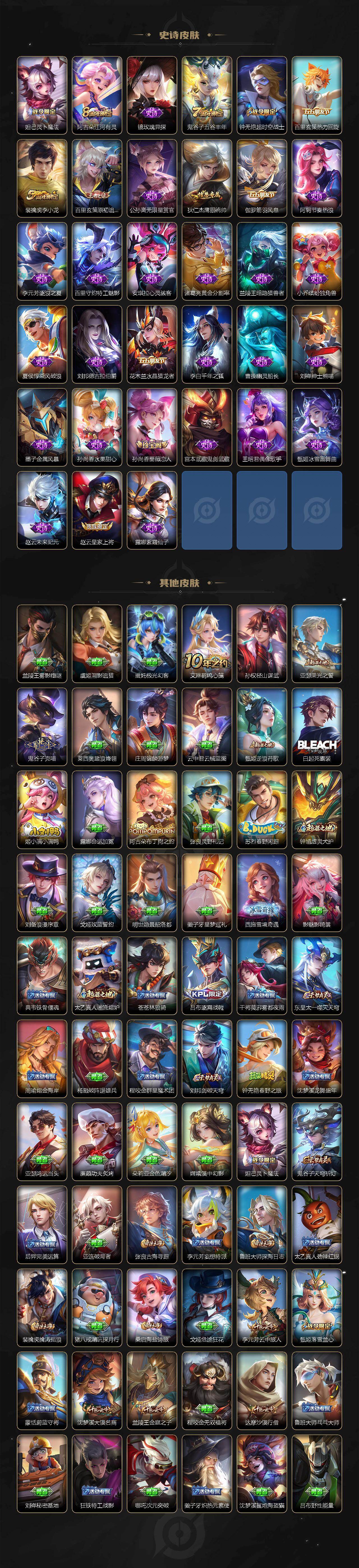 【传说皮肤】:云缨神骥越千峰,马超神骥逐星野,云缨幻光神枪,赵云乘龙铭钟鼎,马超琥珀纪元,达摩黄金狮子座,后羿黄金射手座,貂蝉仲夏夜之梦,宫本武藏地狱之眼,孙悟空地狱火