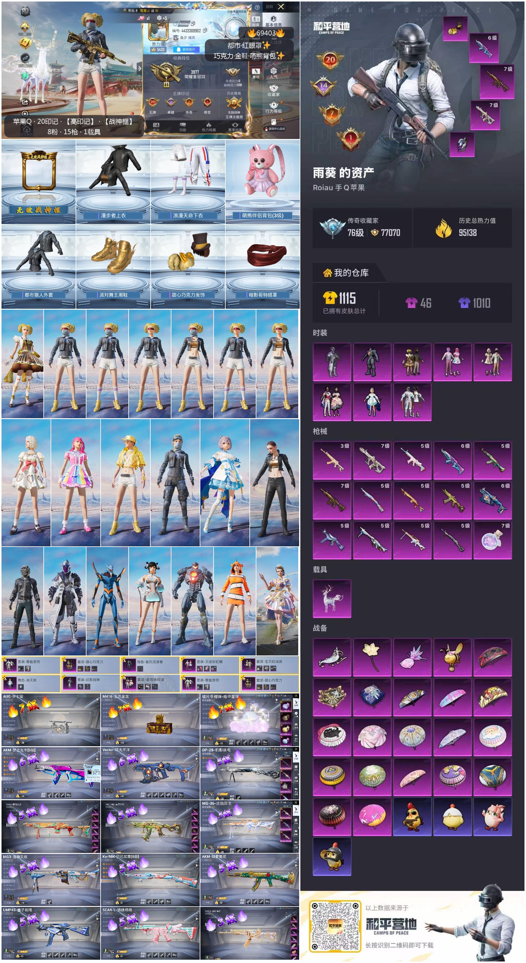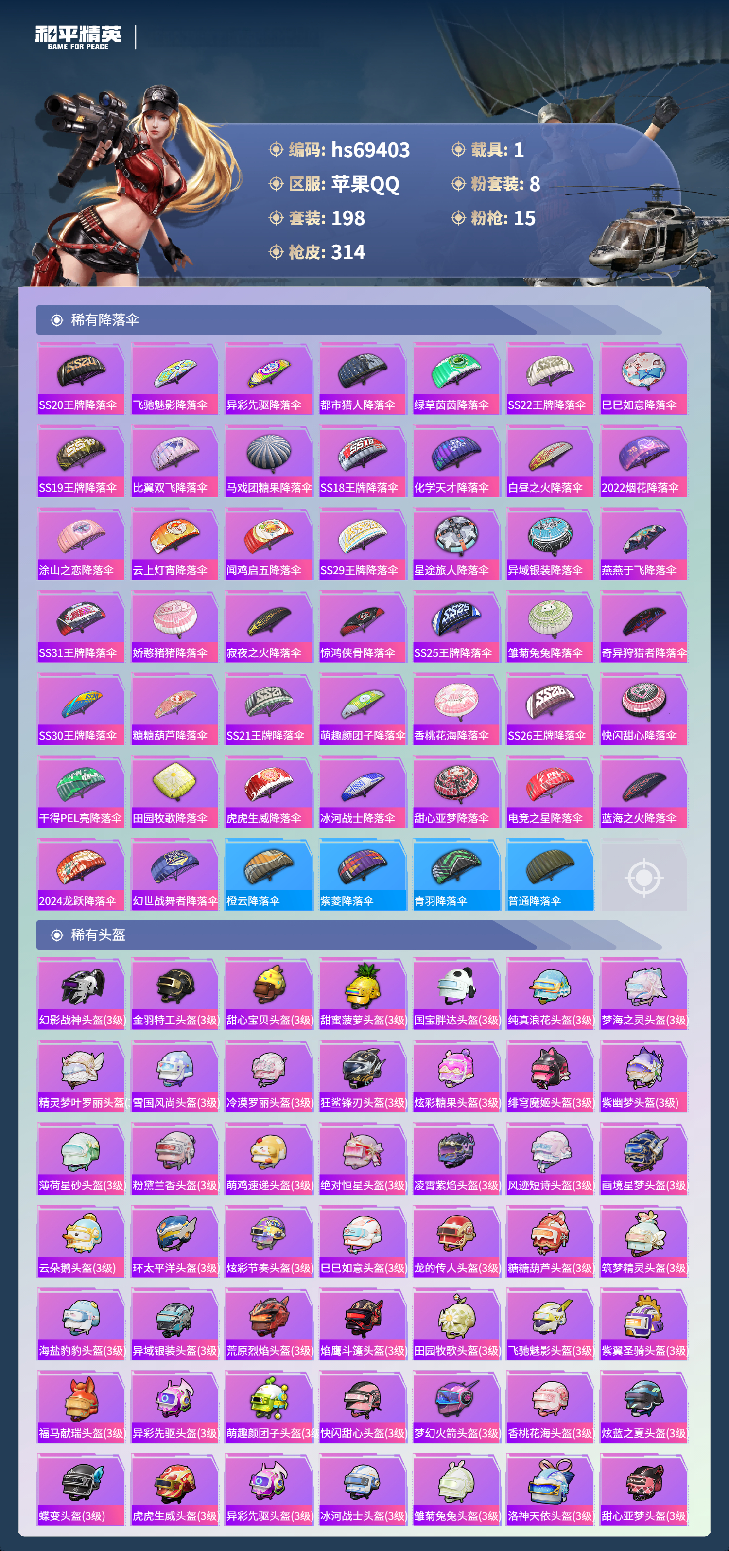 hs69403 苹果手Q-20王牌印记-有战神框-8粉装-15特效枪-1载具-95138热力值-198套装-314枪皮-14卓越印记-7传奇印记