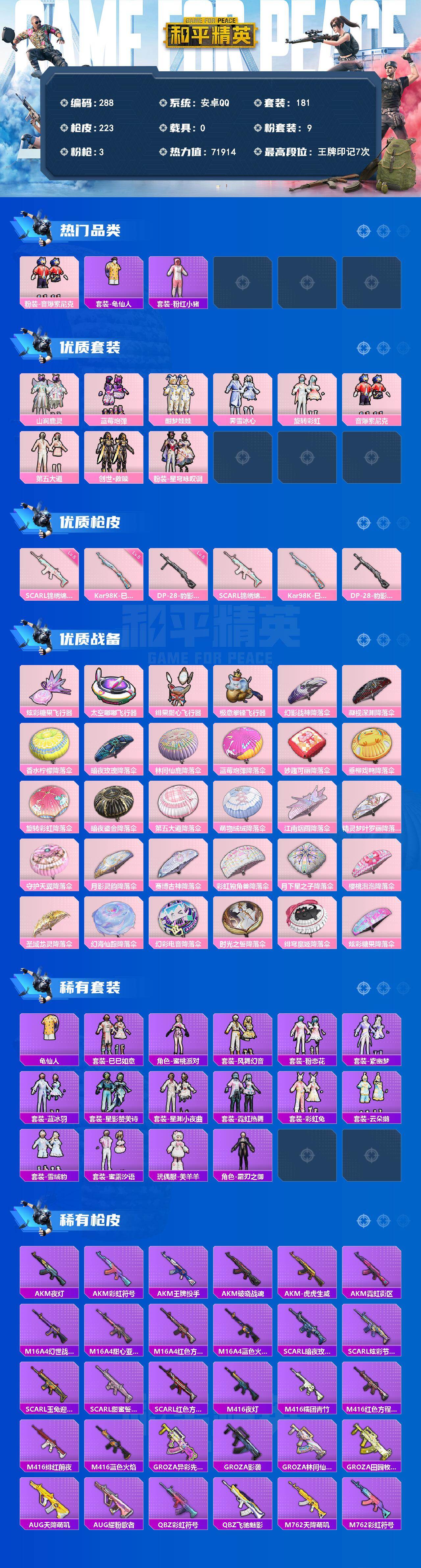 A1754安卓 手Q-9粉装-3特效枪-0载具-4粉色飞行器-71914热力值-7王牌印记-181套装-223枪皮