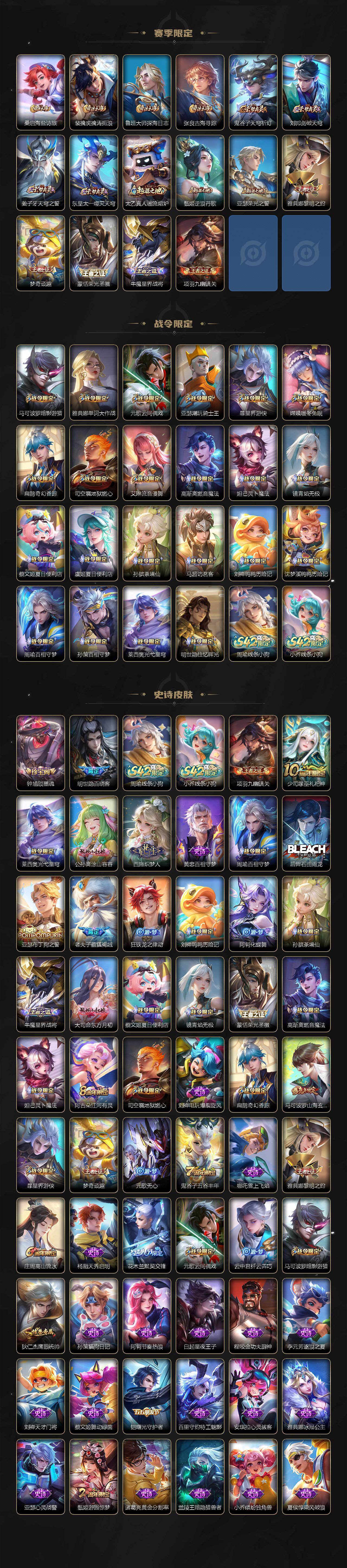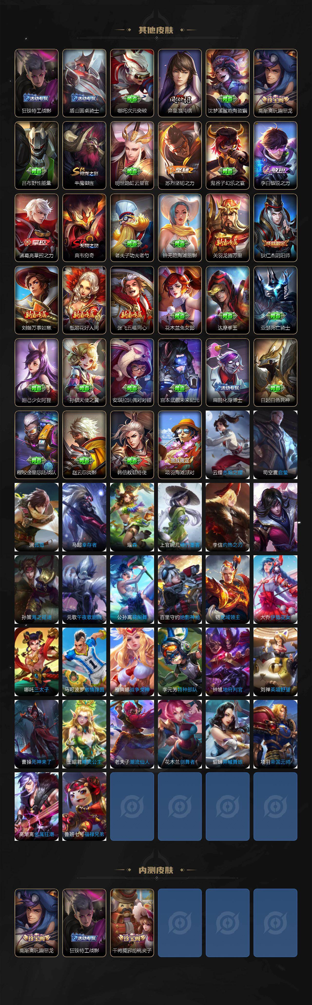 【传说皮肤】:后羿神树通天,司空震愿照山河定,澜愿照九州拓,云缨幻光神枪,桑启鸣野蒿,澜逐花归海,李白诗剑行,曜云鹰飞将,李信一念神魔,花木兰冠军飞将,梦奇胖达荣荣,宫本武藏地狱之眼