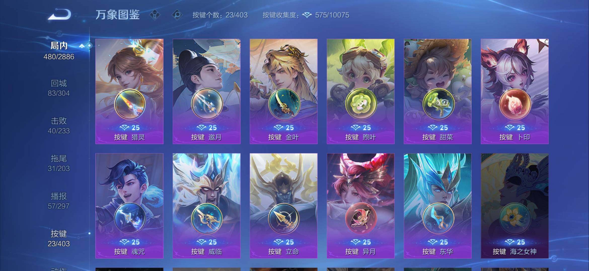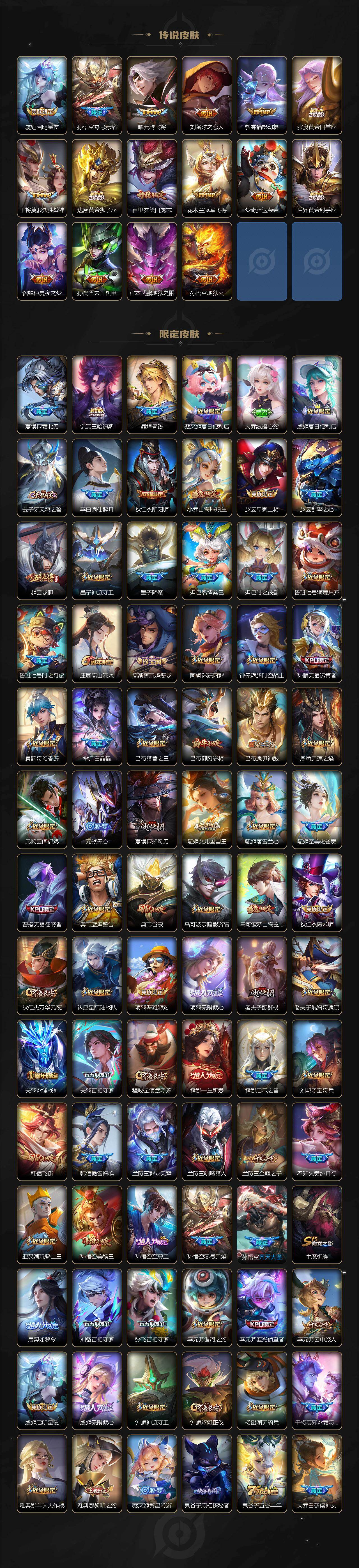 【英雄全皮】:元歌全皮,露娜全皮,姜子牙全皮,孙权全皮,鬼谷子全皮,铠全皮,苏烈全皮,盾山全皮,孙策全皮,猪八戒全皮,敖隐全皮,蒙恬全皮,莱西奥全皮,戈娅全皮,空空儿全皮,影全皮,海诺全皮,少司缘全皮