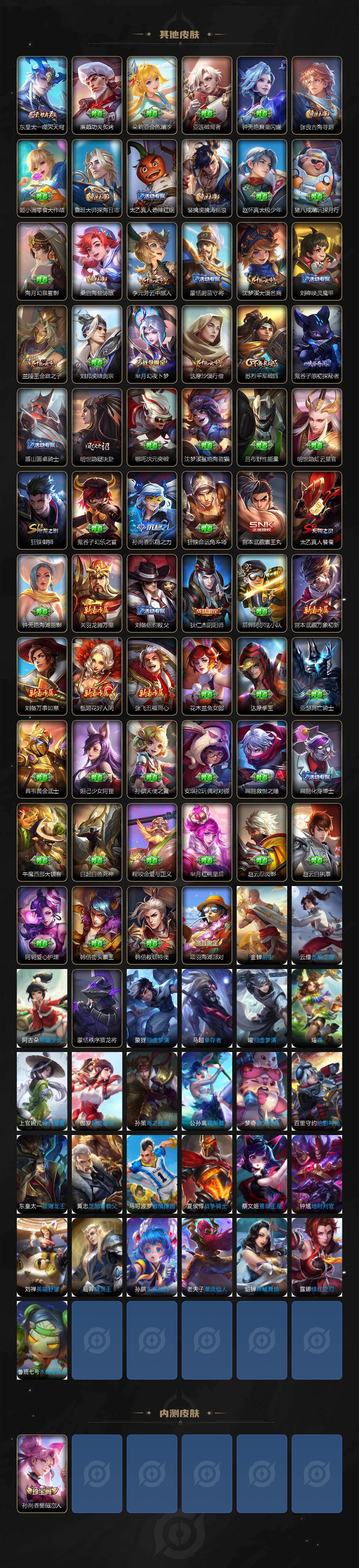 【传说皮肤】:狄仁杰神骥赴朔漠,后羿神树通天,公孙离云诺千山,司空震愿照山河定,云缨幻光神枪,澜逐花归海,露娜霜月吟,李白诗剑行,王昭君星穹之声,马超无双飞将,孙尚香异界灵契,小乔音你心动,镜炽阳神光,干将莫邪久胜战神,孙尚香末日机甲,宫本武藏地狱之眼