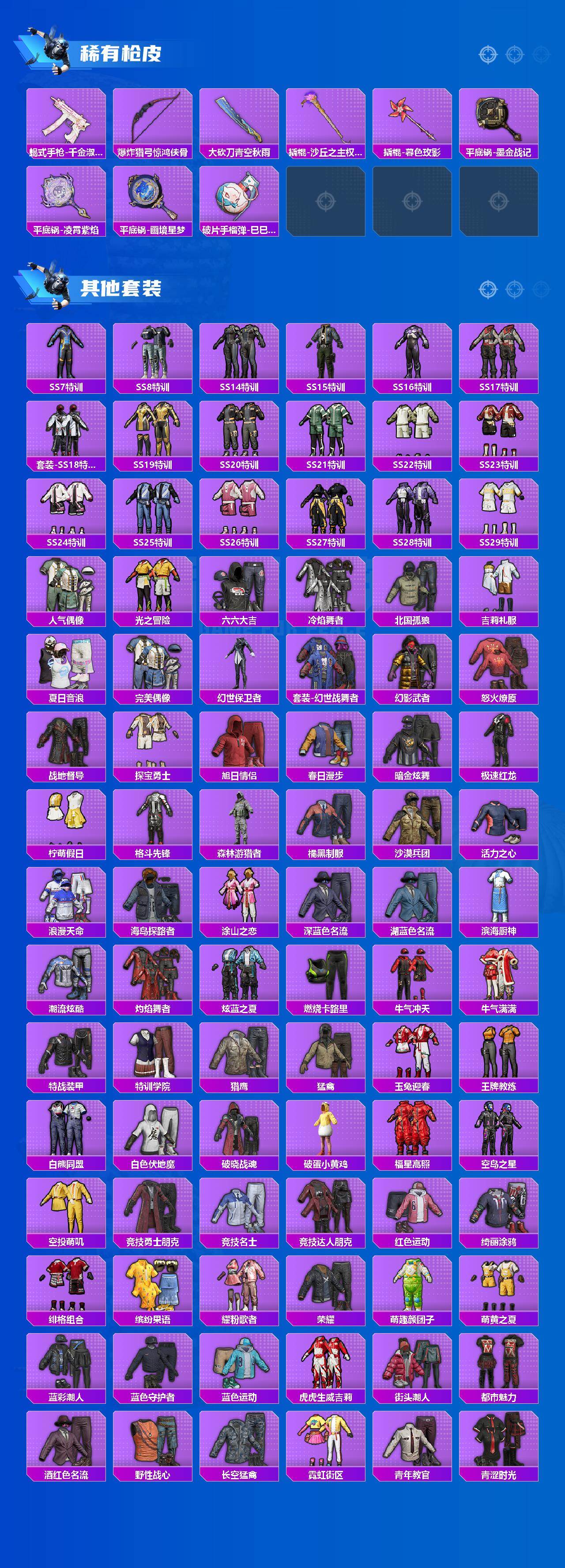 【粉色套装】:粉装-极限特训,角色-复仇流浪者,粉装-彩虹甜喵,角色-烟云彩露,角色-守护天翼