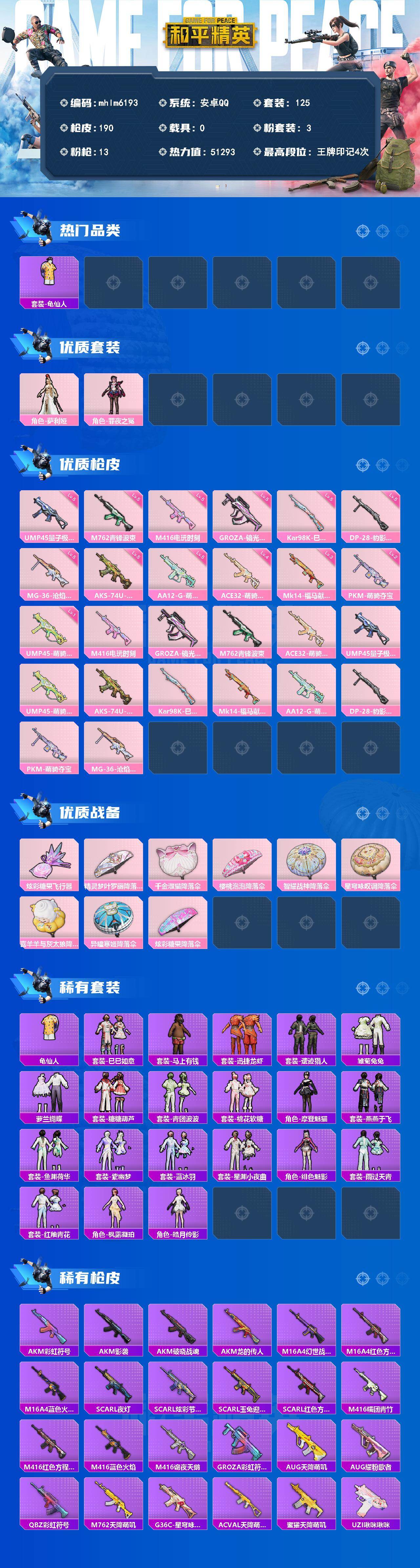 【mhlm6193】安卓 手Q-3粉装-13特效枪-0载具-1粉色飞行器-51293热力值-4王牌印记-125套装-190枪皮