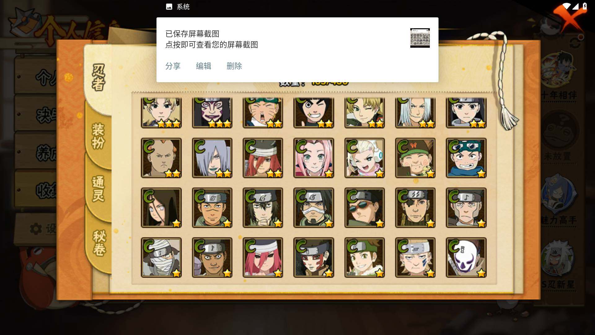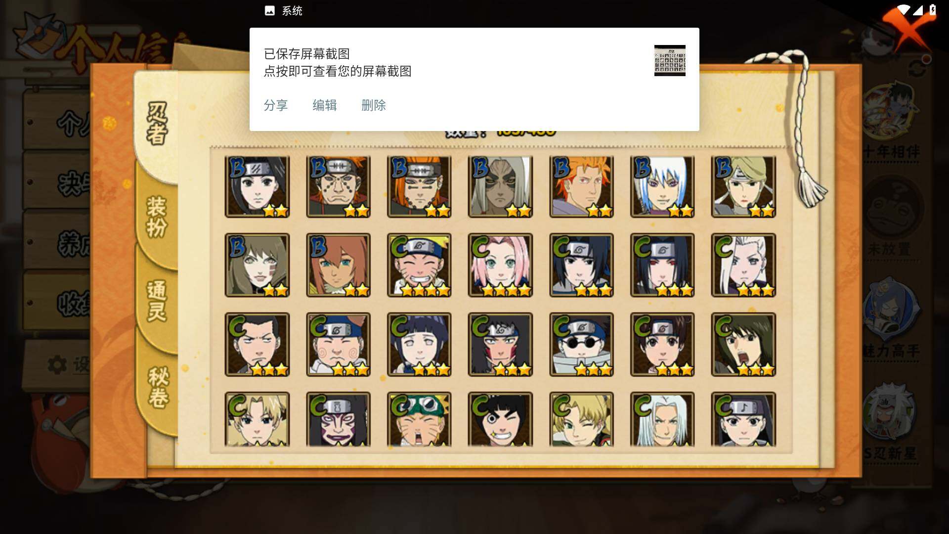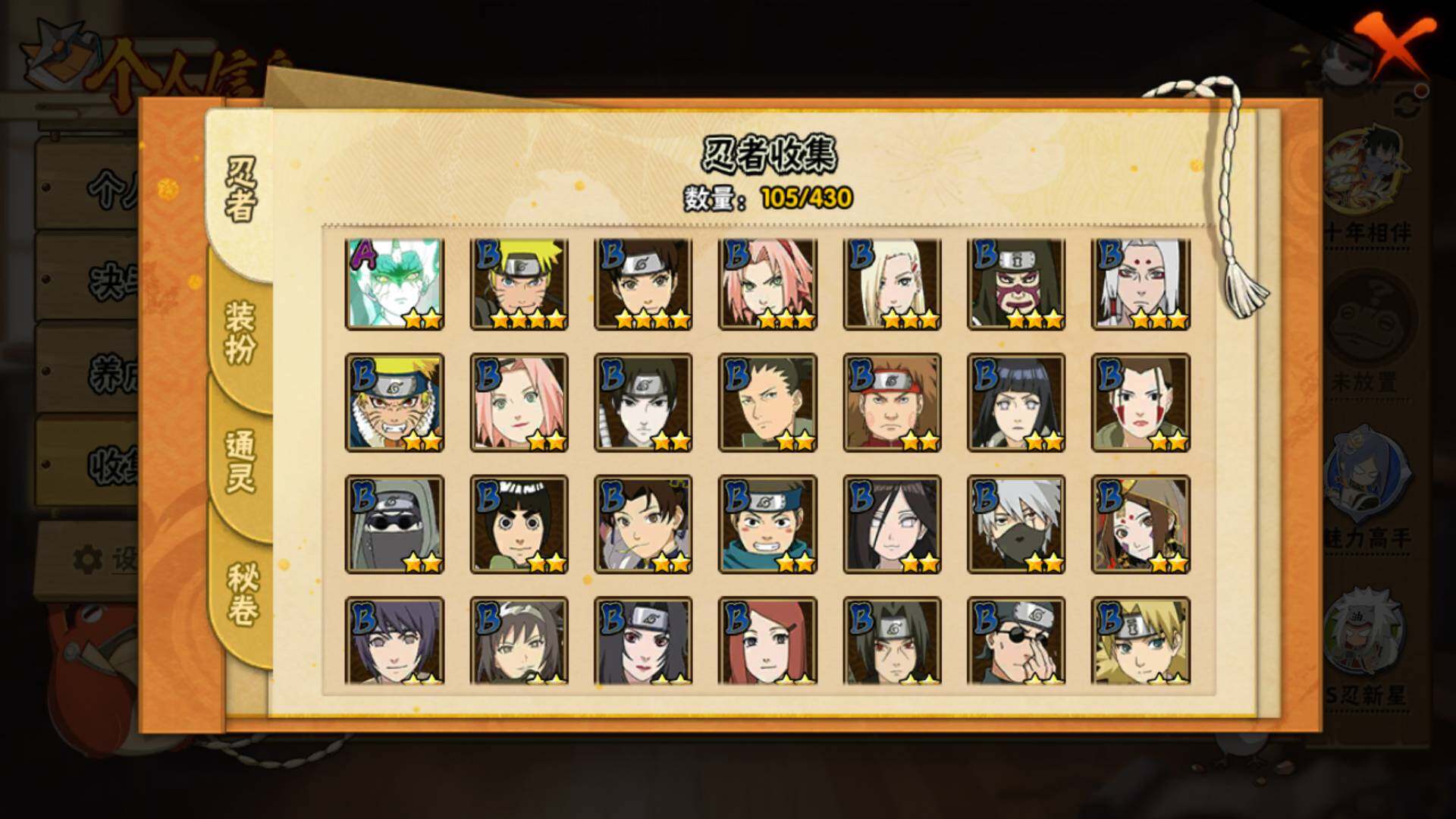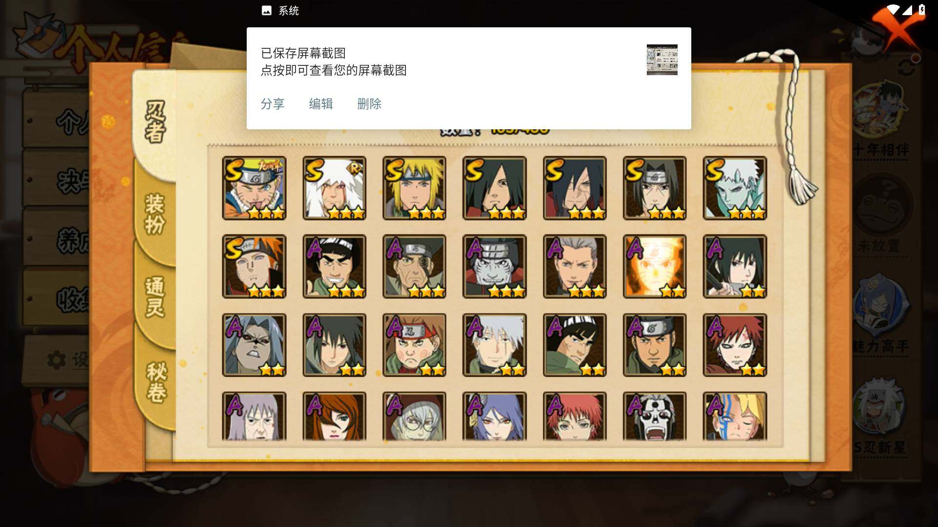 【S级忍者】:宇智波斑「秽土转生·解」(3星),宇智波鼬「须佐能乎」(3星),自来也「舞之豪杰」(3星),宇智波斑(3星),波风水门(3星),佩恩「天道」(3星),漩涡鸣人·宇智波佐助(3星),宇智波带土「十尾人柱力」(3星)
