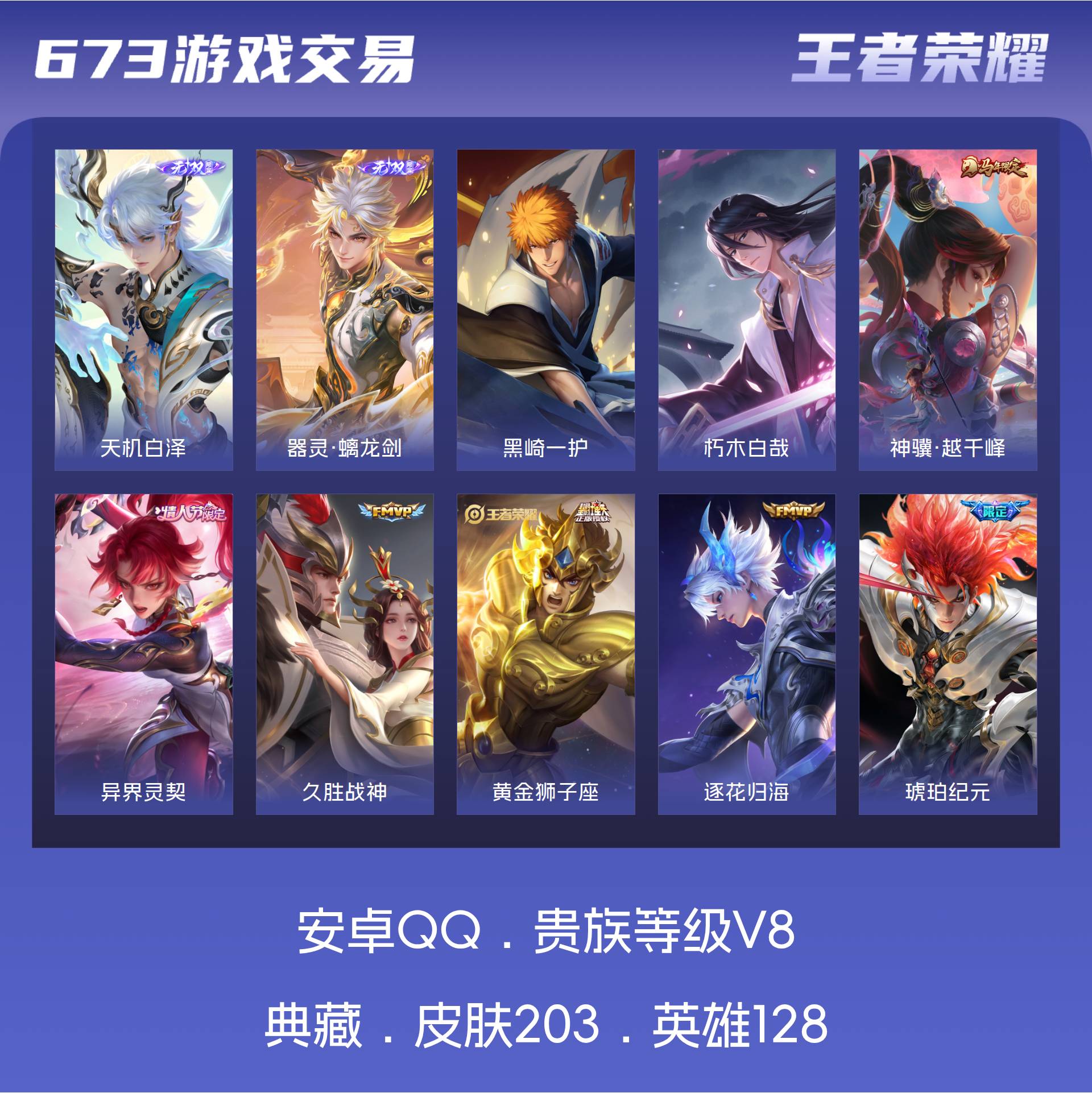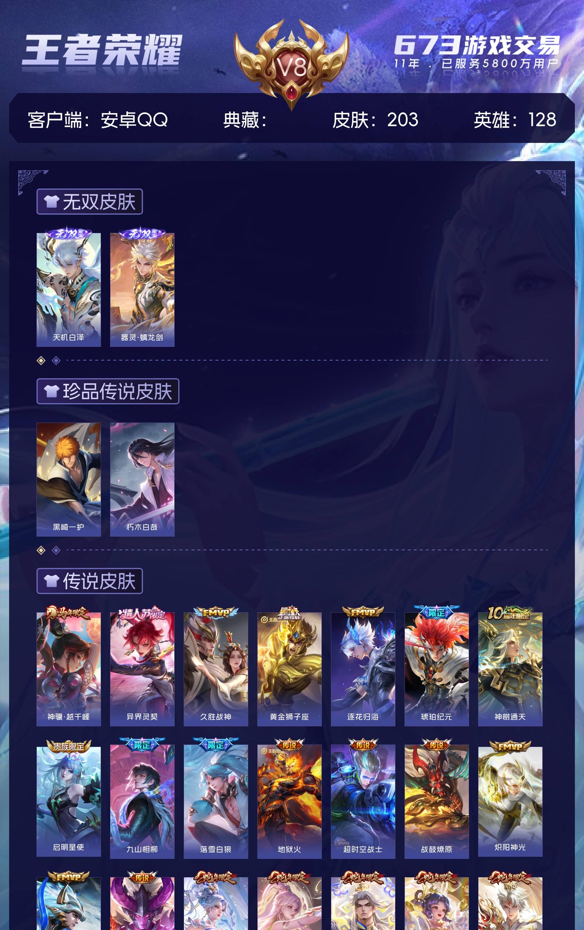 V8 皮肤203 英雄128 最强王者 无双皮肤2 珍品传说2 星传说1 传说27