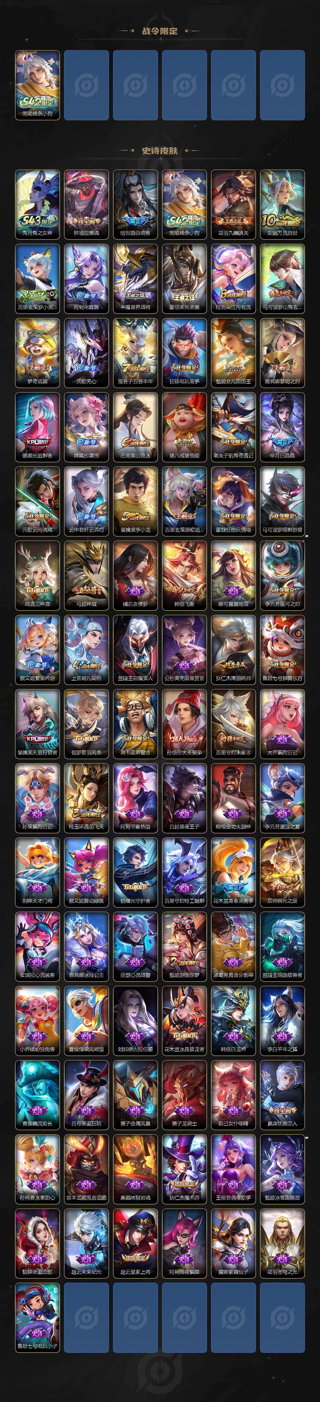 【传说皮肤】:阿轲罗刹妄海,澜愿照九州拓,虞姬愿照岁时盈,露娜霜月吟,李白诗剑行,孙尚香异界灵契,公孙离祈雪灵祝,虞姬启明星使,李信一念神魔,伽罗太华,张良黄金白羊座,干将莫邪久胜