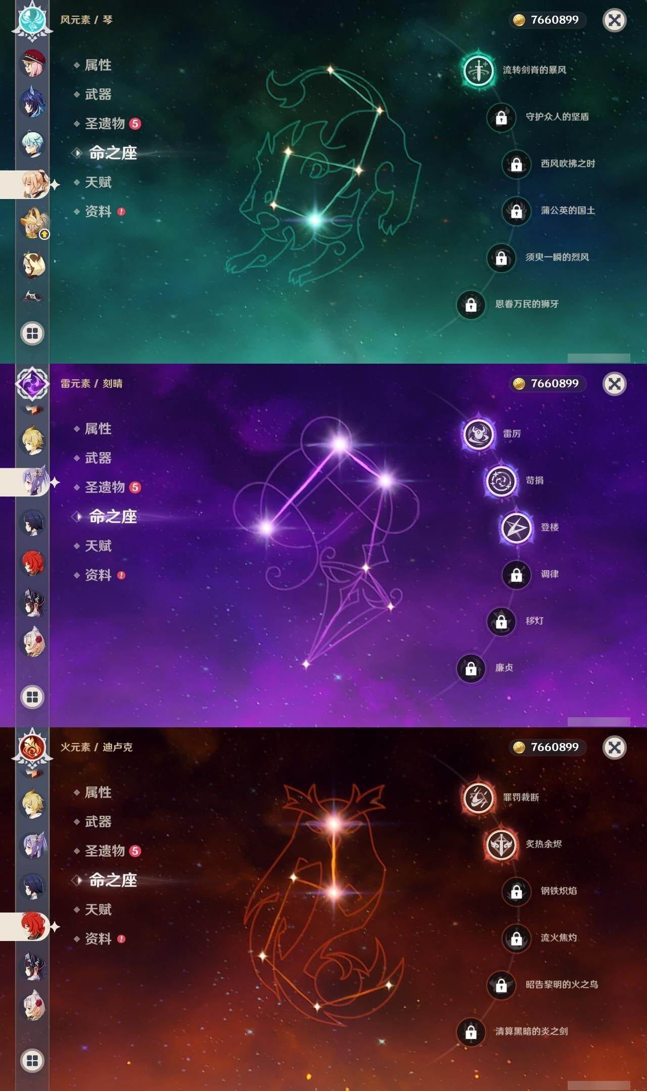 1命阿蕾奇诺,2命芙宁娜,0命林尼,0命纳西妲,0命妮露,4命提纳里,1命夜兰,0命八重神子,5命雷电将军,0命枫原万叶,1命胡桃,0命珊瑚宫心海,3命刻晴,1命琴,1命莫娜,2命迪卢克,0命玛拉妮,0命恰斯卡,精1赤月之形,精1图莱杜拉的回忆,精1圣显之钥,精1若水,精2波乱月白经津,精1薙草之稻光,精1飞雷之弦振,精1护摩之杖,精2四风原