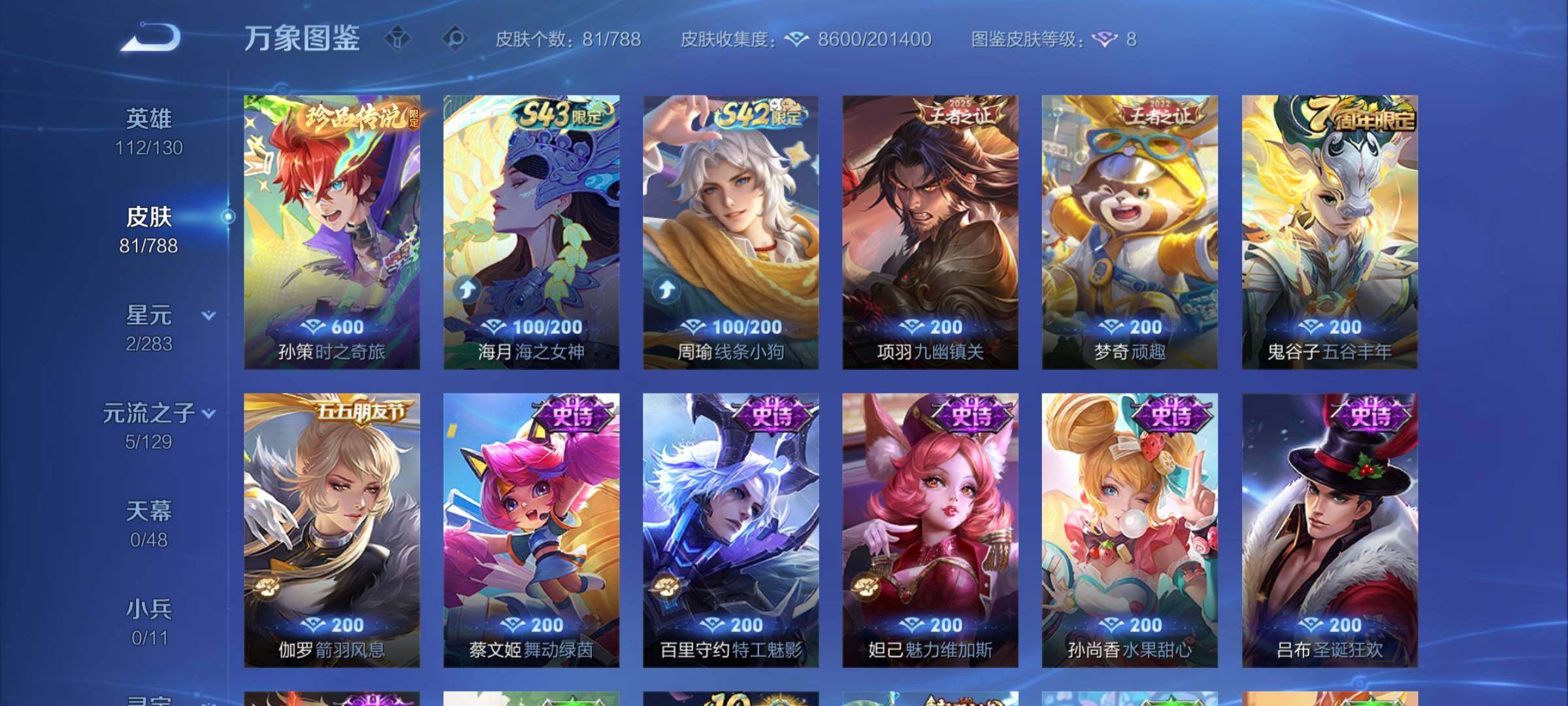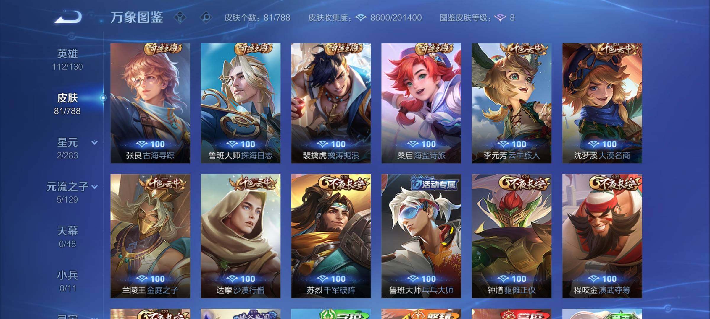【限定皮肤】:狄仁杰阴阳师,狄仁杰万华元夜,达摩沙漠行僧,程咬金演武夺筹,兰陵王金庭之子,李元芳云中旅人,钟馗驱傩正仪,鬼谷子原初探秘者,鬼谷子五谷丰