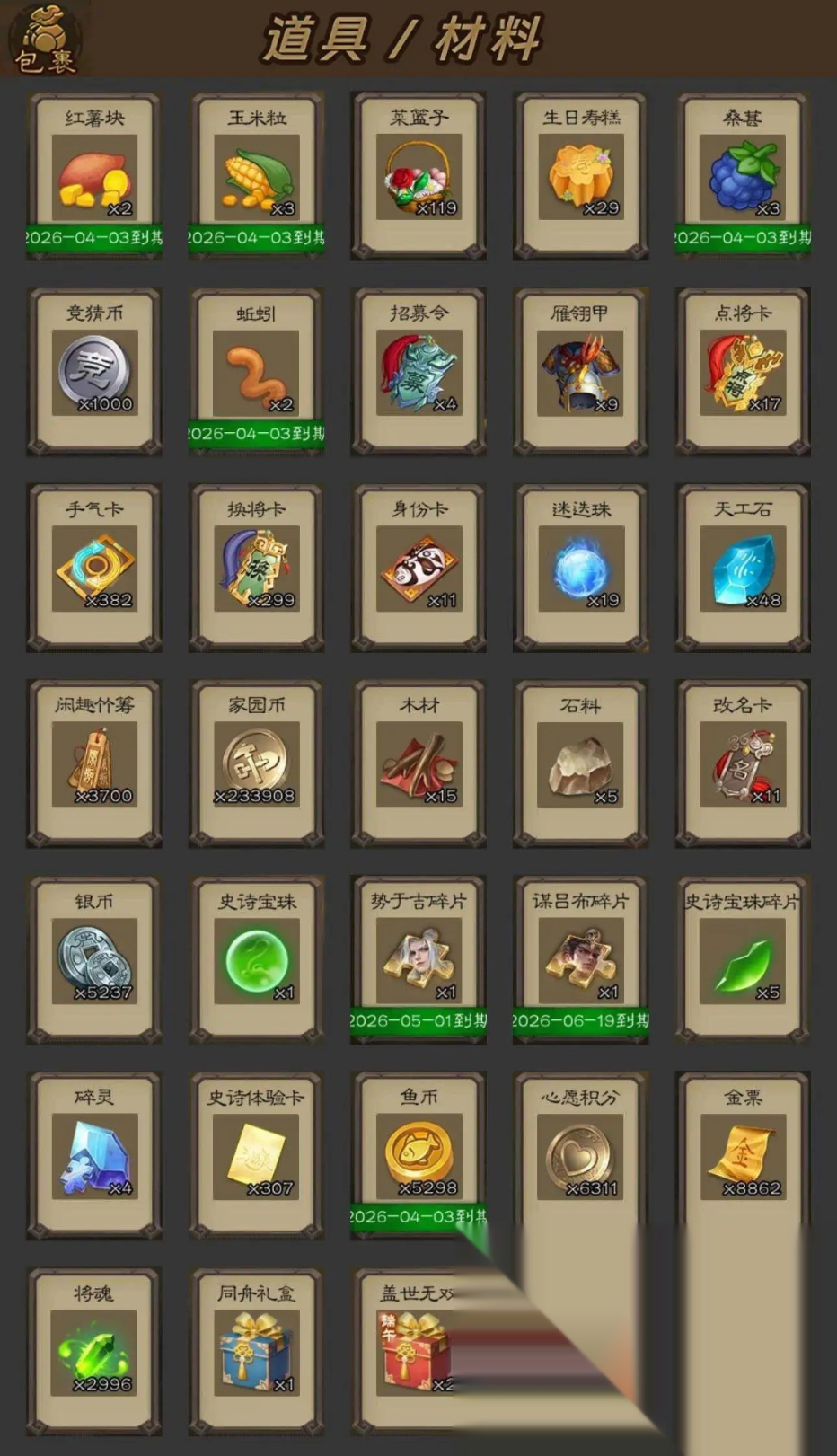 VIP8骠骑将军,261武将,274皮肤,16动皮,1史诗宝珠,22史诗武将:五星界徐盛、四星孙寒华、四星曹婴、四星王元姬、四星留赞、四星骆统、兀突骨、审配、左慈、星黄忠、曹纯、沙摩柯、界黄忠、神周瑜、神赵云、神鲁肃、程昱、诸葛瞻、谋夏侯氏、谋赵云、谋马超、谯周、麹义 谋张飞、李傕 绵竹之殇·诸葛瞻、虎年春节·曹纯、西凉雄狮·谋马超、长沙阻敌·星黄忠,17点将卡,299换将卡,382手气卡