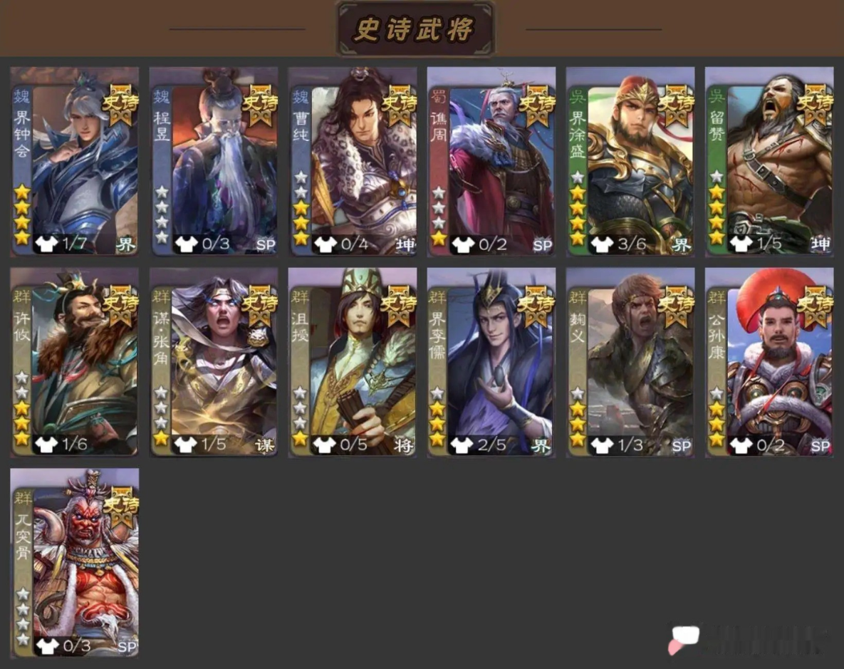 VIP9骠骑将军,248武将,246皮肤,20动皮,2史诗宝珠,13史诗武将:四星界徐盛、四星界钟会、四星留赞、兀突骨、公孙康、曹纯、沮授、界李儒、神吕蒙、神诸葛亮、程昱、许攸、谋张角、谯周、麹义 谋甄姬、谋张飞、李傕、星徐晃 兼资文武·神吕蒙,1743换将卡,1963手气卡,1144点将卡