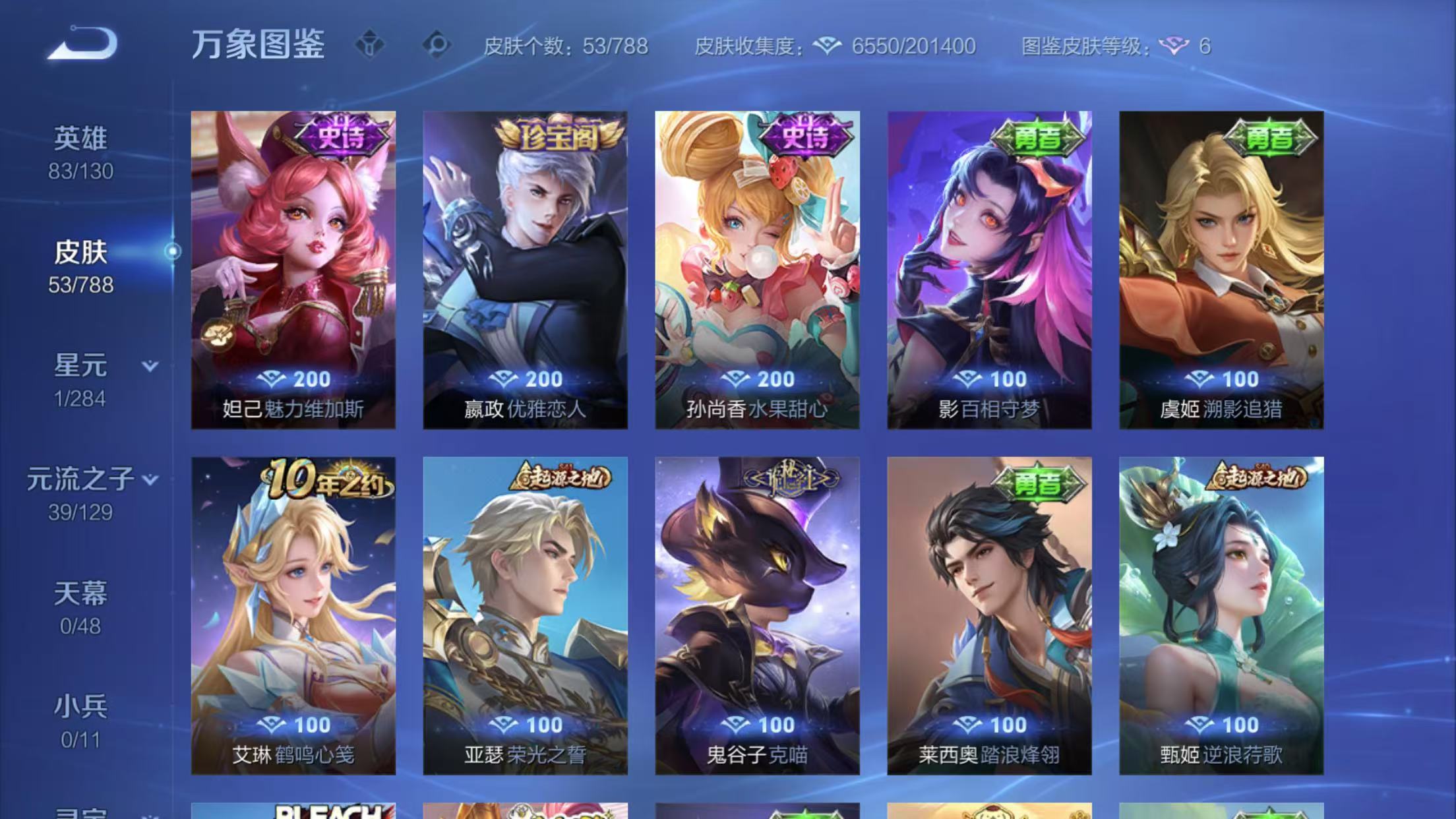 有嬴政和,敖隐。亚瑟七周年,艾琳十周年的限定皮肤,后羿周年限定,黄金白羊座。千年之狐