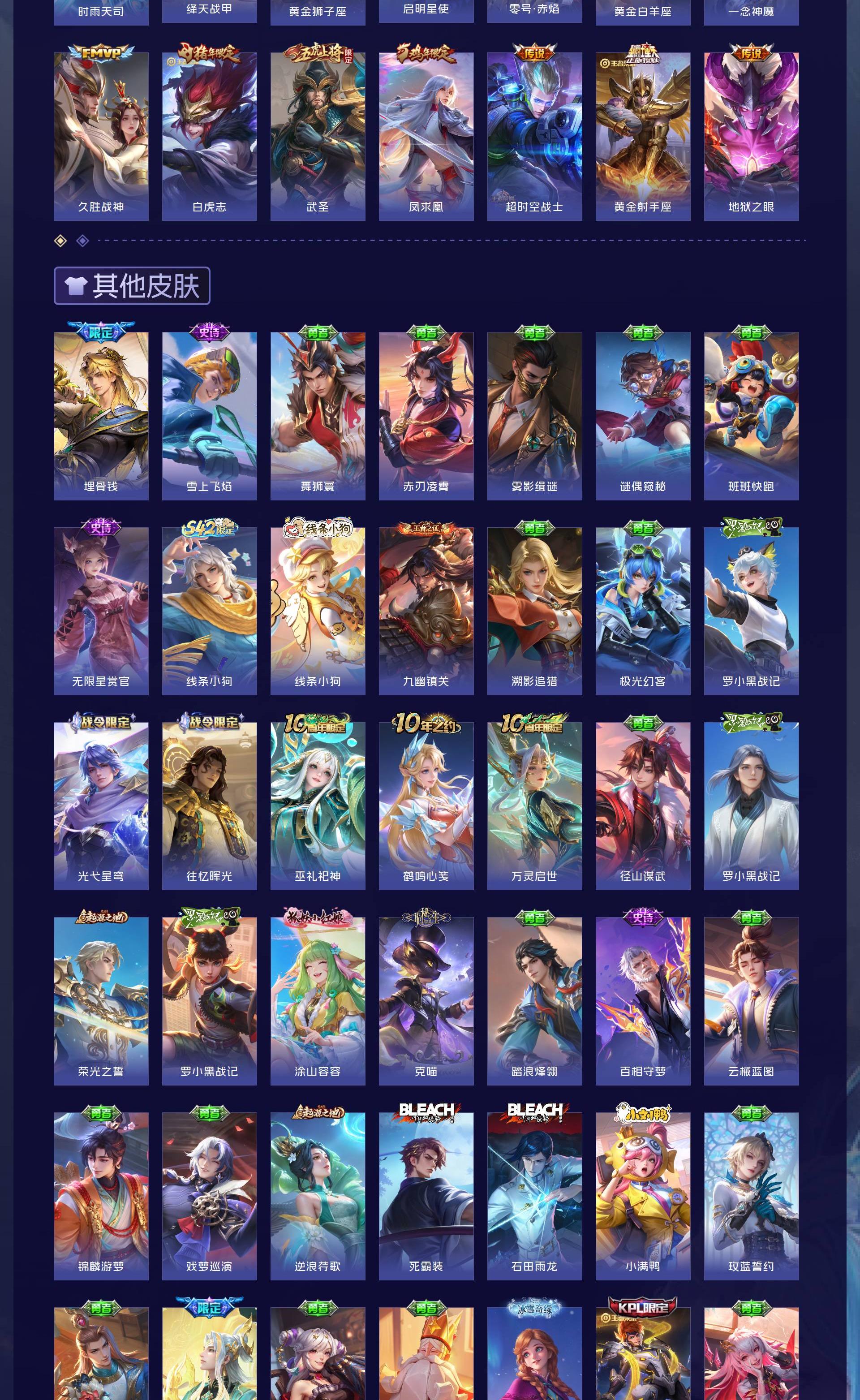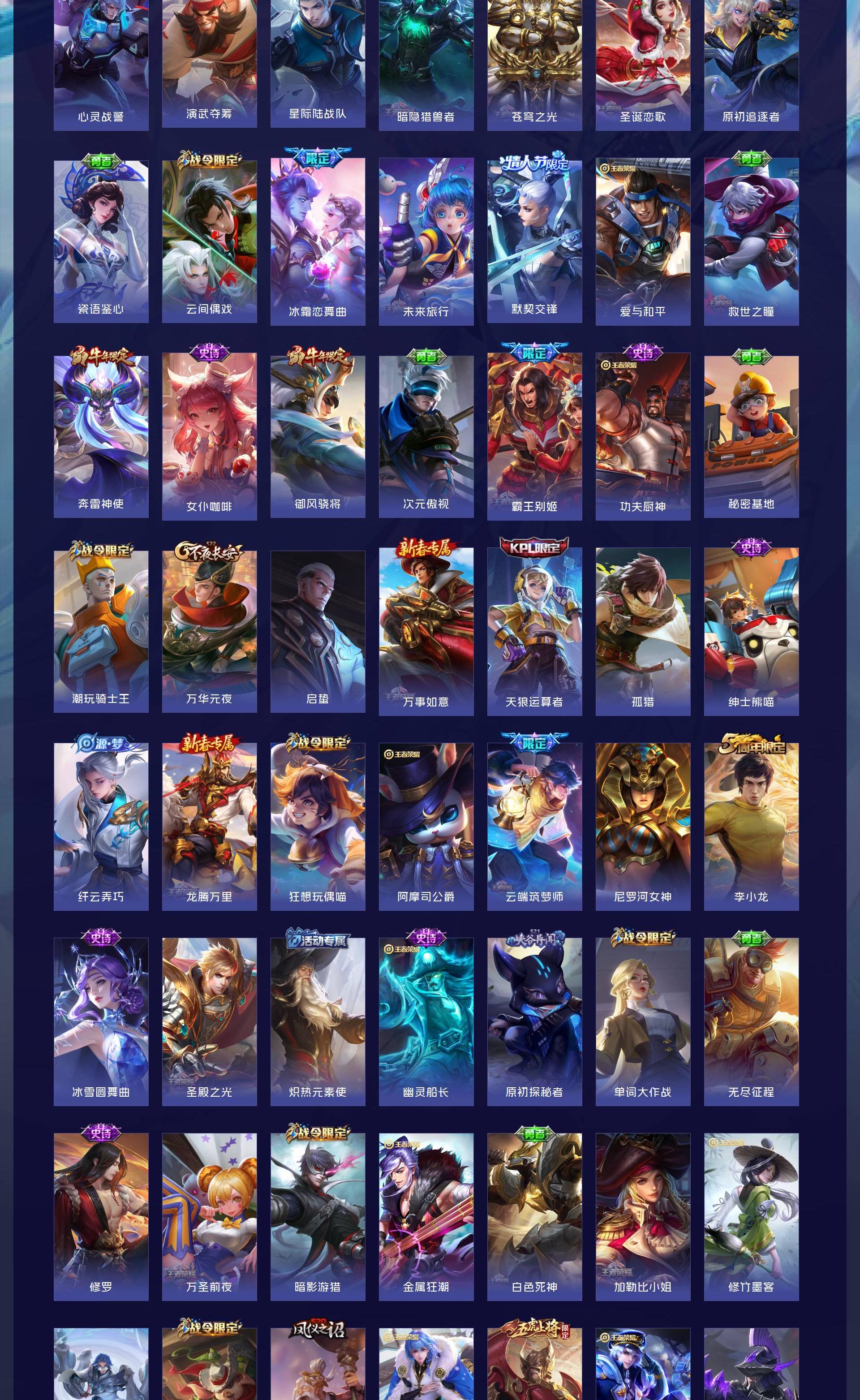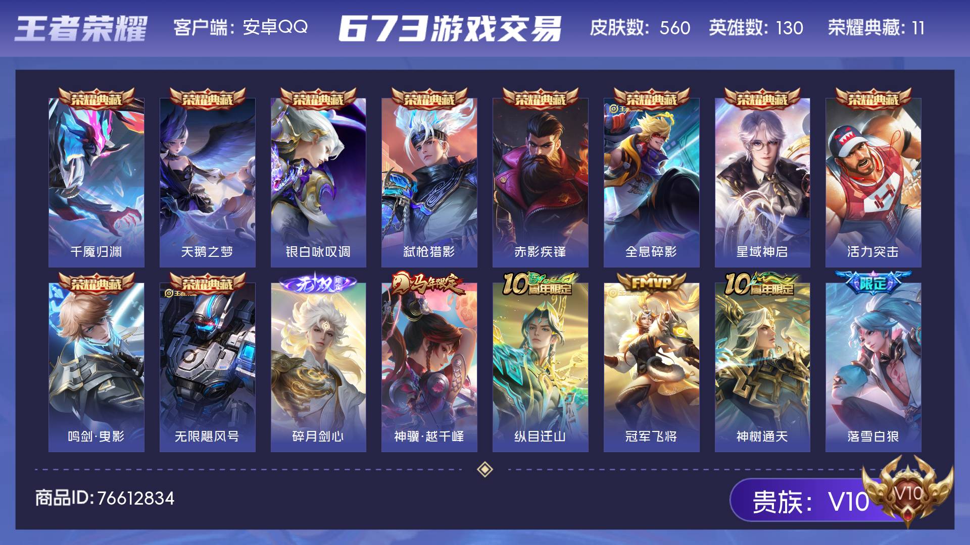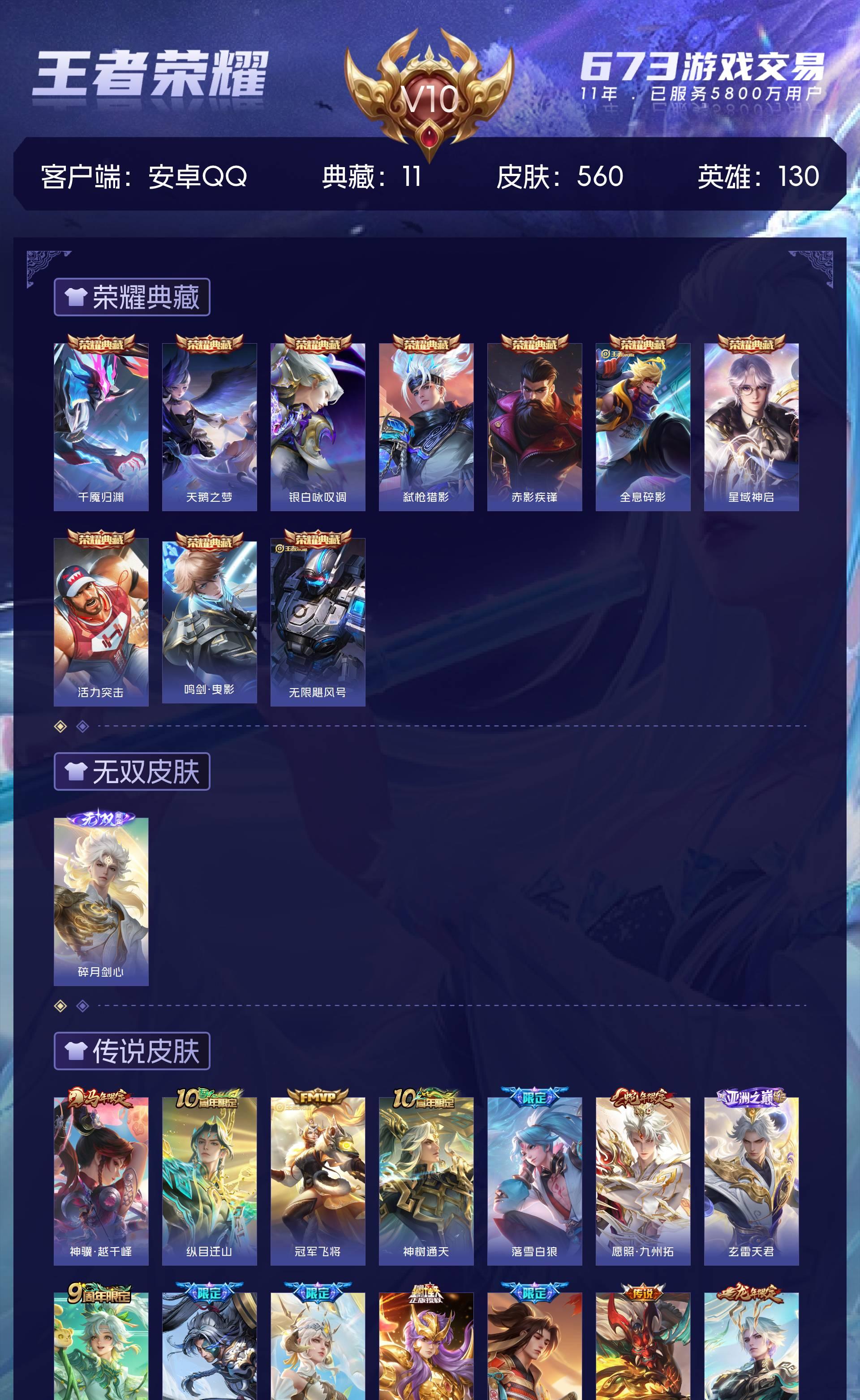 V10 皮肤560 英雄130 至尊星耀 荣耀典藏11 无双皮肤1 传说71