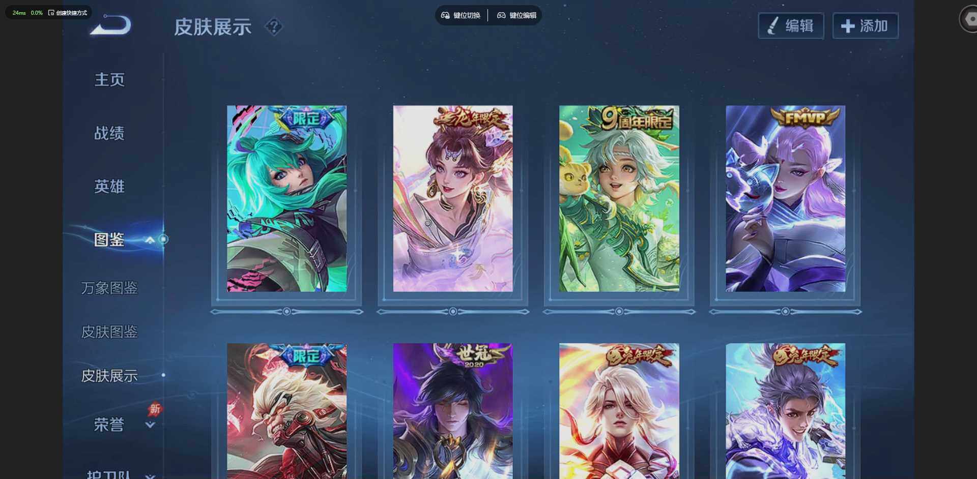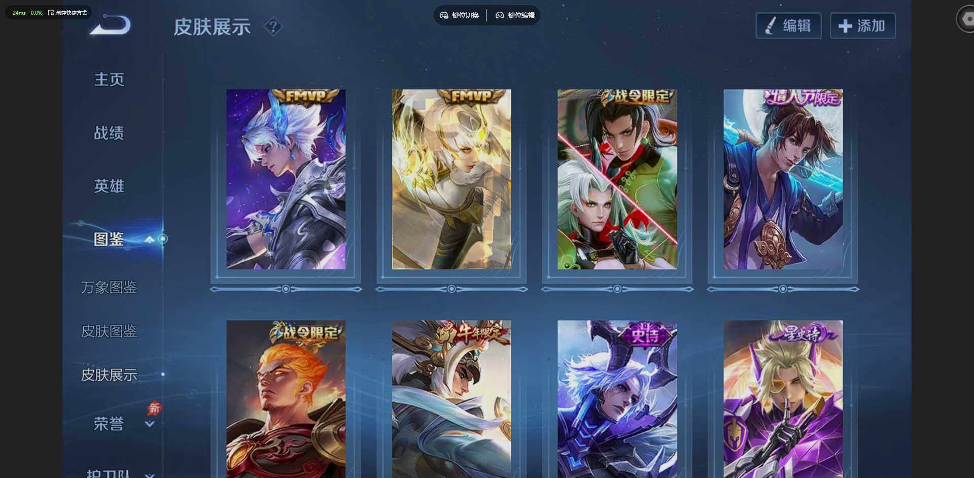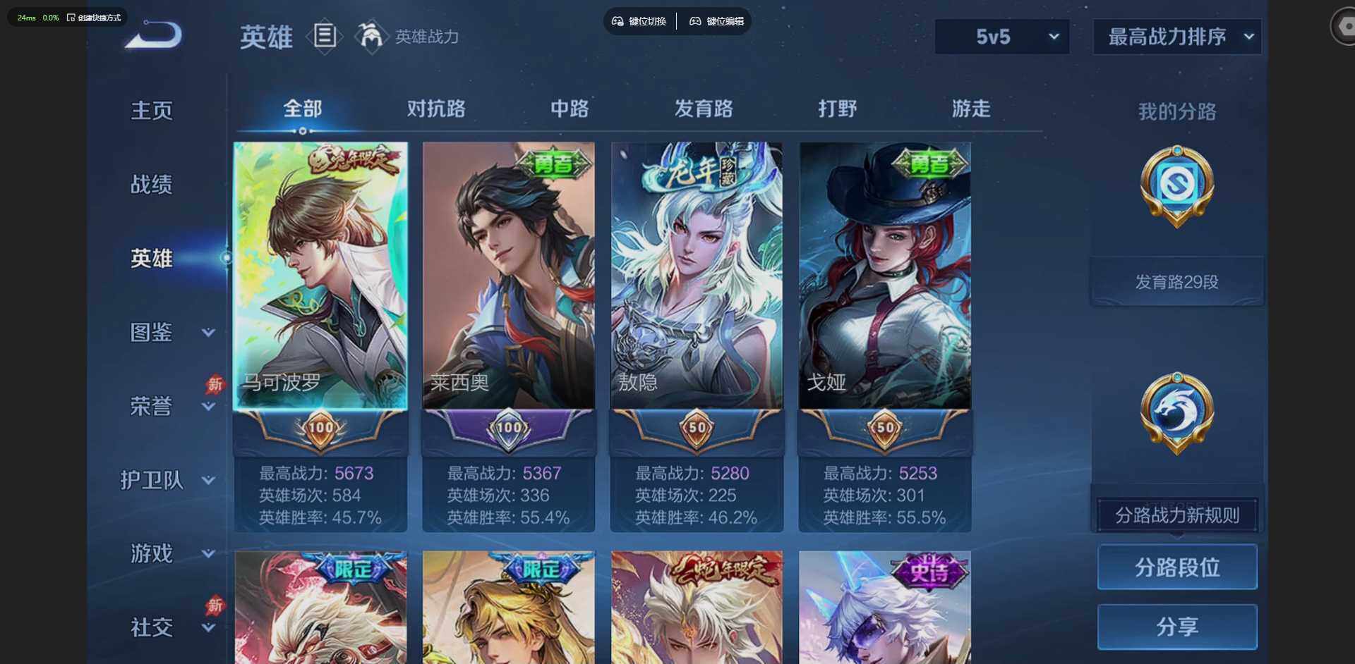 1/贵族等级: V7 英雄数: 129 皮肤数: 189 荣耀水晶: 银白咏叹调 星传说: 幽冥之眼 传说皮: 猫影幻舞,炽阳神光,一念神魔,地狱之眼,山海·炽霜斩,山海·苍雷引,鹤羽星尊,妄想奇谈,霜月吟,澜逐花归海,乘龙·问璇玑,神树通天,神骥·逐星野 限定皮: 御风骁将,美猴王,玄武志,至尊宝,百木心枪,五谷丰年,山海·玄木吟,齐天大圣,鸣野蒿,愿照·九州拓
