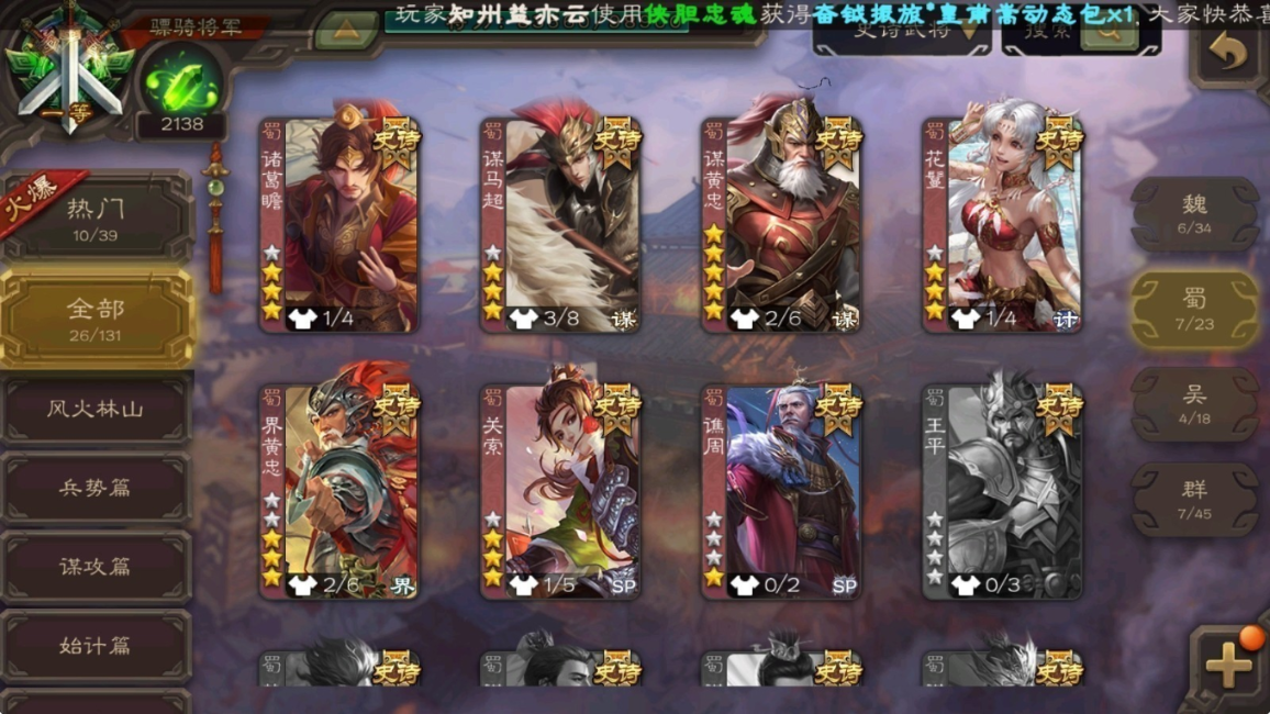 26史诗武将界钟会,界曹真,嵇康,程昱,4星戏志才,3星动皮曹纯,诸葛瞻,谋马超,5星谋黄忠,花鬘,界黄忠,关索,谯周,骆统,4星界徐盛,贺齐,4星动皮留赞,沮授,界李儒,卑弥呼,苏飞,公孙康,兀突骨,4星裴秀,神将:动皮神吕蒙,神周瑜,神诸葛亮,神张辽,5星动皮神荀彧,谋徐晃,谋庞统,谋刘赪,谋张飞,谋吕蒙,谋于禁,谋高顺,谋华雄,荀谌,卞夫人,糜夫人,孔融,桥公,蒋琬蒋钦,