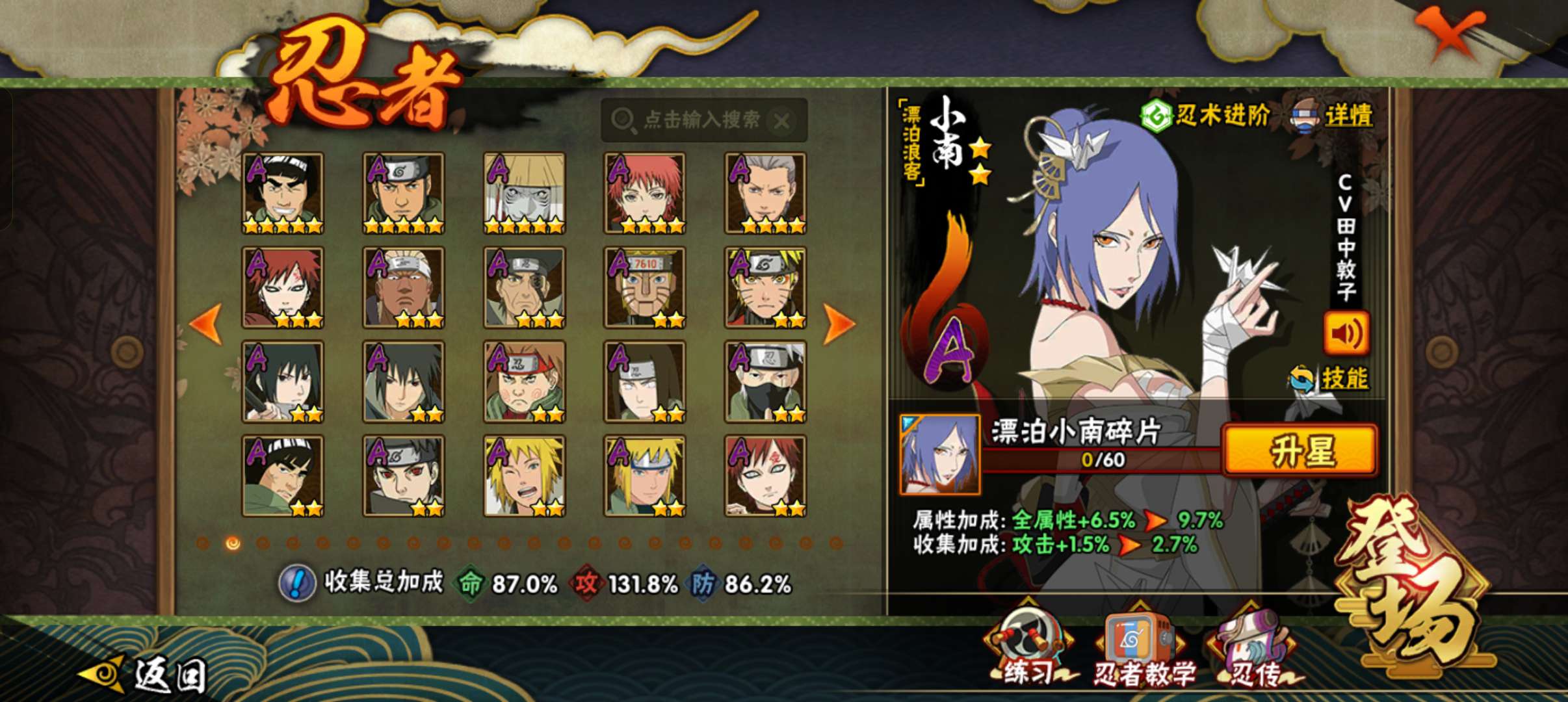 S忍20个;A忍36个;通灵兽20个;秘卷44个;战斗力:1193w
