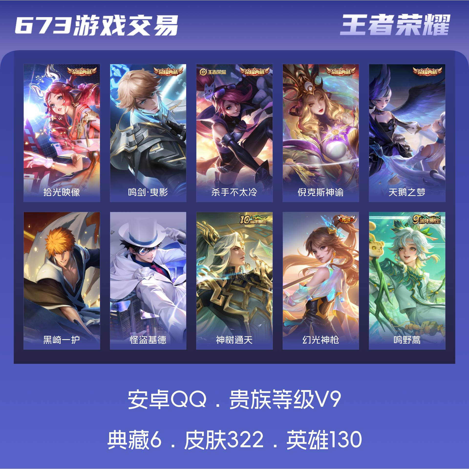 V9 皮肤322 英雄130 永恒钻石 荣耀典藏6 珍品传说2 星传说2 传说25