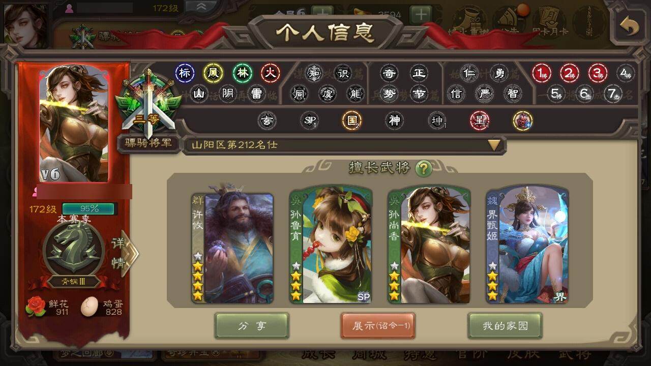 官阶:骠骑将军 VIP等级:VIP6级 史诗武将数:9 动态皮肤数:14 武将