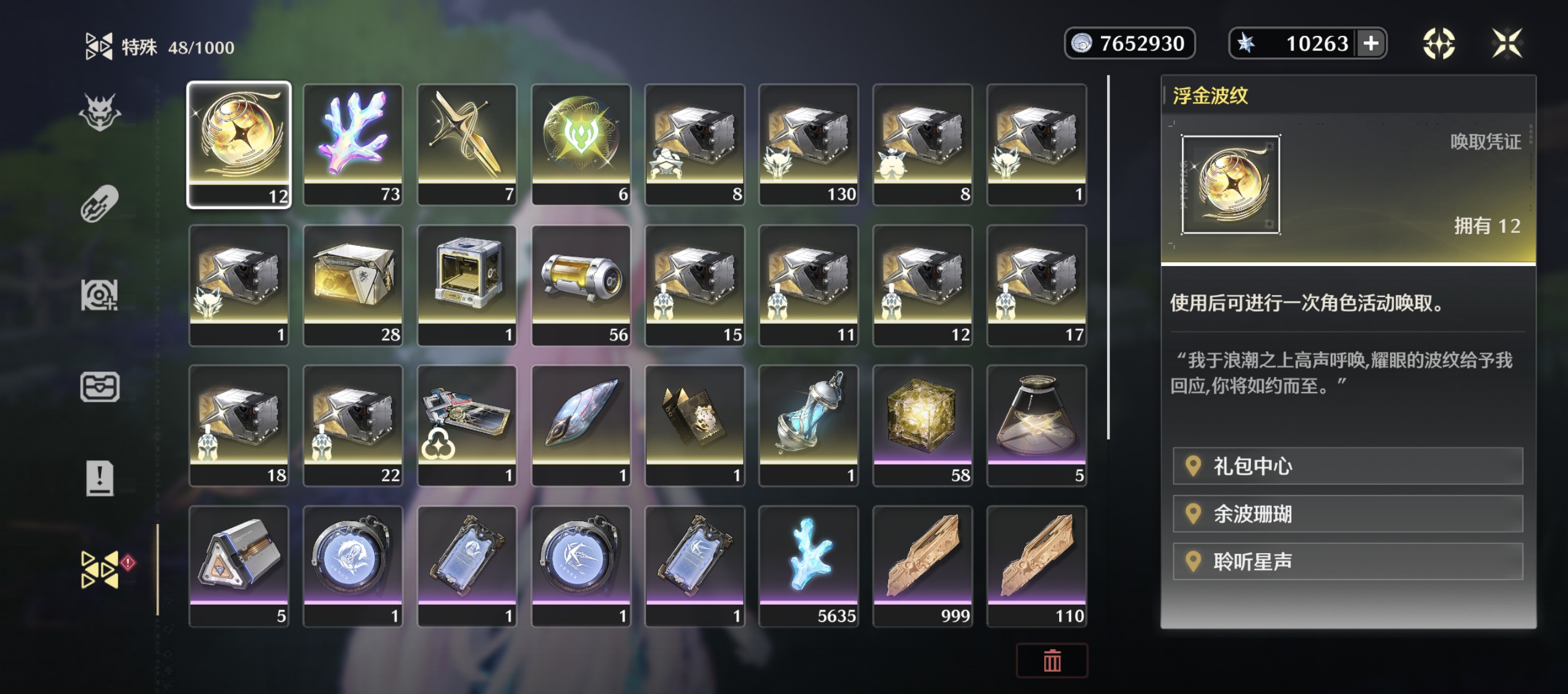 6+1爱弥斯,千咲,限定角色大保底,武器垫35抽,一万多星声,抽数,地图资源。稳出绯雪或者聚爆副c.