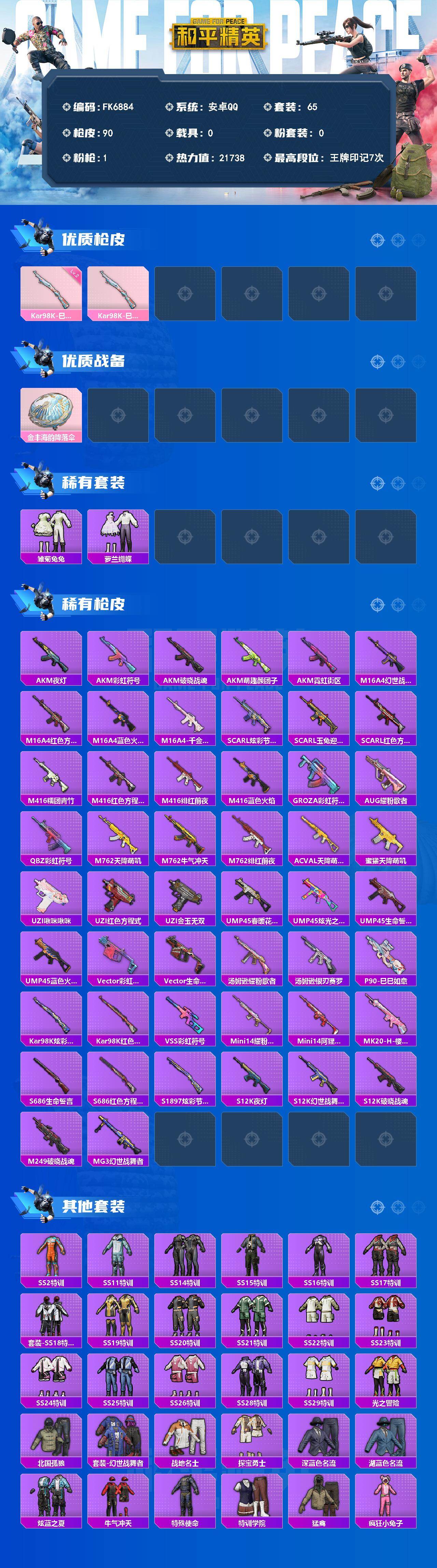 【FK6884】65套装/枪械1/装备54/战备65/王牌印记7/热力值21738/二级Kar98K-巳巳如意/Kar98K-巳巳如意/金丰海韵降落伞/雏菊兔兔/萝兰蝴蝶/AKM-夜灯/AKM-彩虹符号/AKM-破晓战魂/AKM-萌趣颜团子/AKM-霓虹街区/M16A4-幻世战舞者/M16A4-红色方程式/M16A4-蓝色火焰/M16A4-千金淑猫/SCAR-L-炫彩节奏/SCAR-L-玉兔迎春