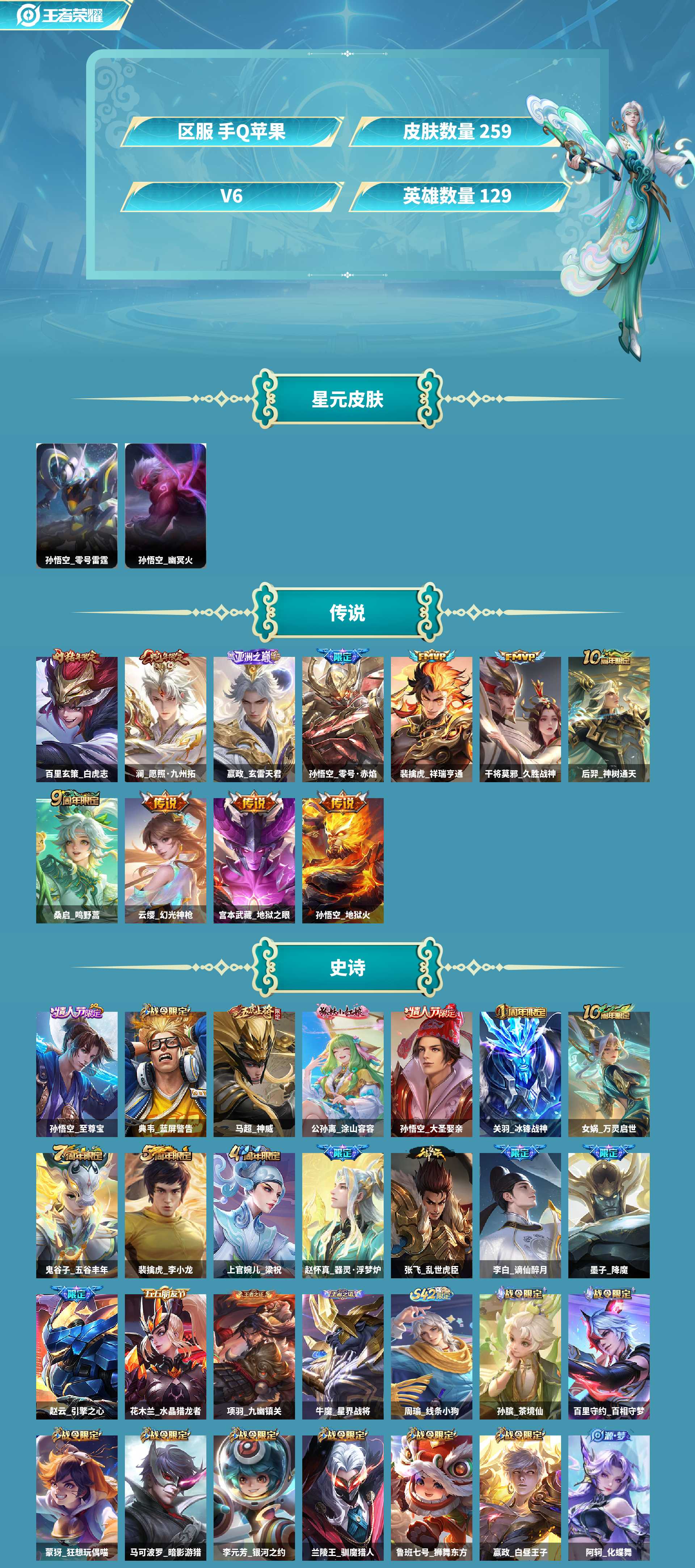 白虎志!玄雷嬴政!蛇限澜!皮肤数量259印记总数10V6尊贵