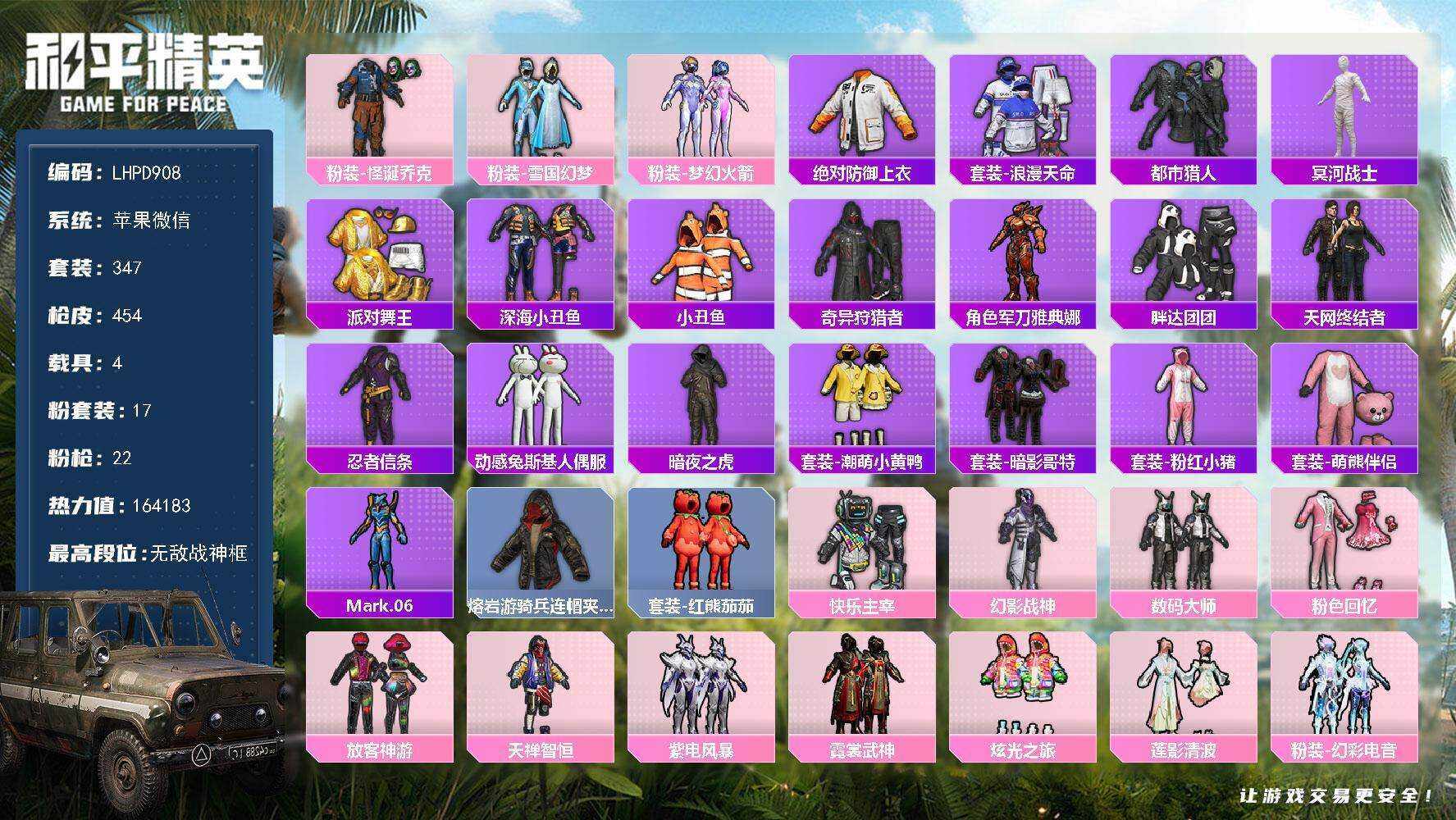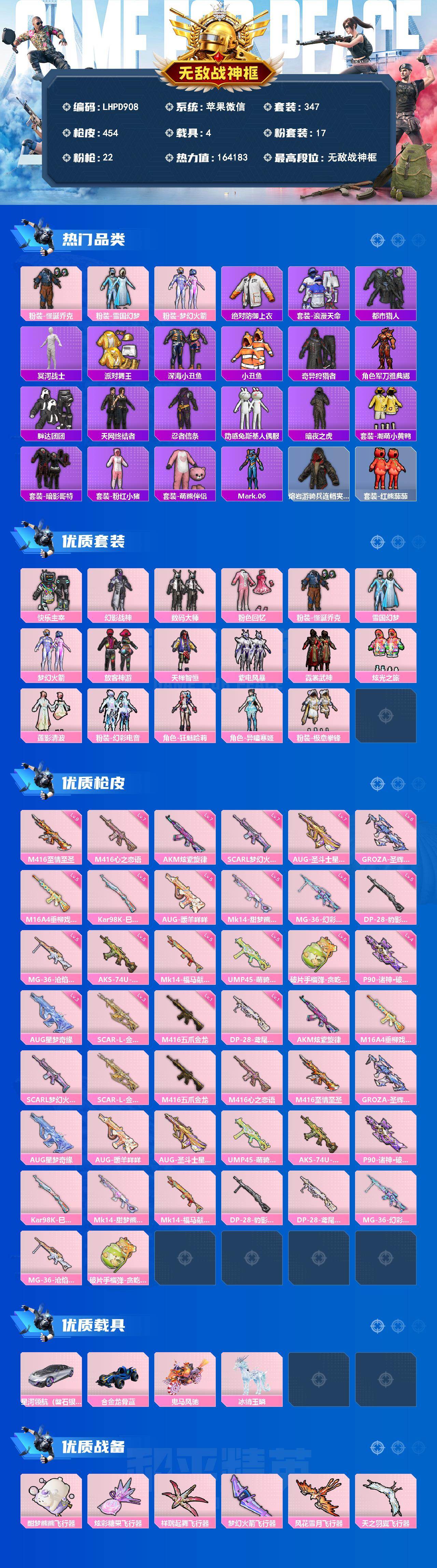 【全套身法素材男神号34印记双战神框乔克都市金鞋巡查衣雪国老木乃伊红番茄天网暗夜之虎胖达小丑鱼满级m4至情至胜】苹果 微信-无敌战神框-17粉装-22特效枪-4载具-13粉色飞行器-164183热力值-34王牌印记-347套装-454枪皮【热门品类】:粉装-怪诞乔克,粉装-雪国幻梦,粉装-梦幻火箭,绝对防御上衣,套装-浪漫天命,套装-都市猎人,套装-冥河战士,套装-派对舞王,套装-深海小丑鱼,套