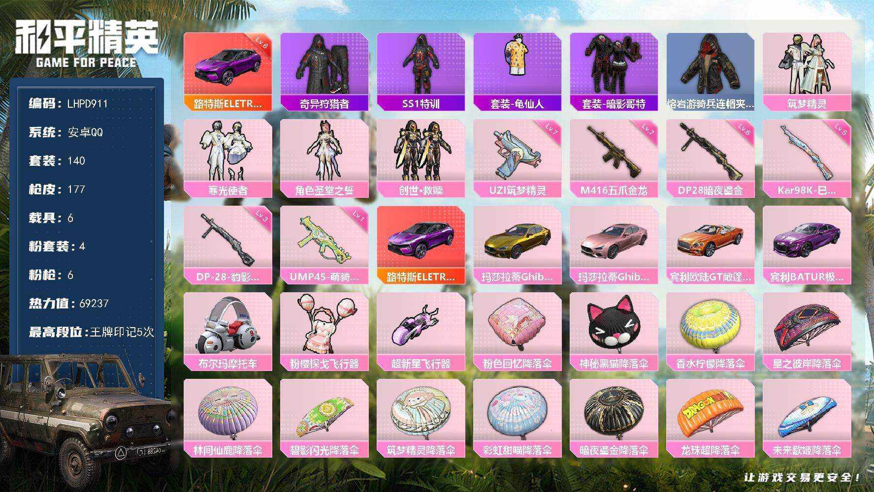 【金玛莎/满级吉普路特斯/奇异狩猎者/暗影哥特红眼罩七级M4五爪金龙】安卓 手Q-4粉装-6特效枪-6载具-2粉色飞行器-69237热力值-5王牌印记-140套装-177枪皮【红色载具】:路特斯ELETRE(电光紫)(六级)【热门品类】:套装-奇异狩猎者,套装-SS1特训,套装-龟仙人,套装-暗影哥特,熔岩游骑兵连帽夹克【粉色套装】:粉装-筑梦精灵,粉装-寒光使者,角色-圣堂之誓,套装-创世·救