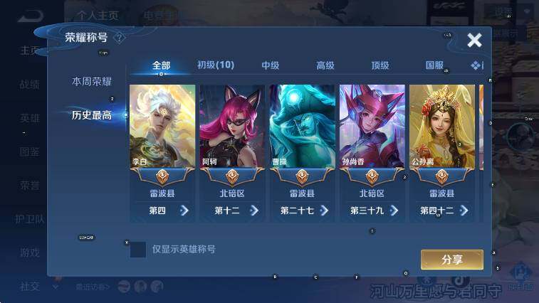 贵族等级7/荣耀典藏数量1/传说皮肤数量11/史诗皮肤数量72/皮肤数量252/英雄数量128/段位最强王者/孙权全皮/敖隐全皮/鸣剑·曳影 李白/碎月剑心 李白/神树通天 后羿/愿照·众生和 妲己/鸣野蒿 桑启/时之奇旅 鲁班七号/诗剑行 李白/乞巧织情 王昭君/云霓雀翎 虞姬/黄金射手座 后羿/凤求凰 李白/末日机甲 孙尚香/地狱之眼 宫本武藏/天穹之誓 姜子牙/阴阳师 狄仁杰/皇家上将