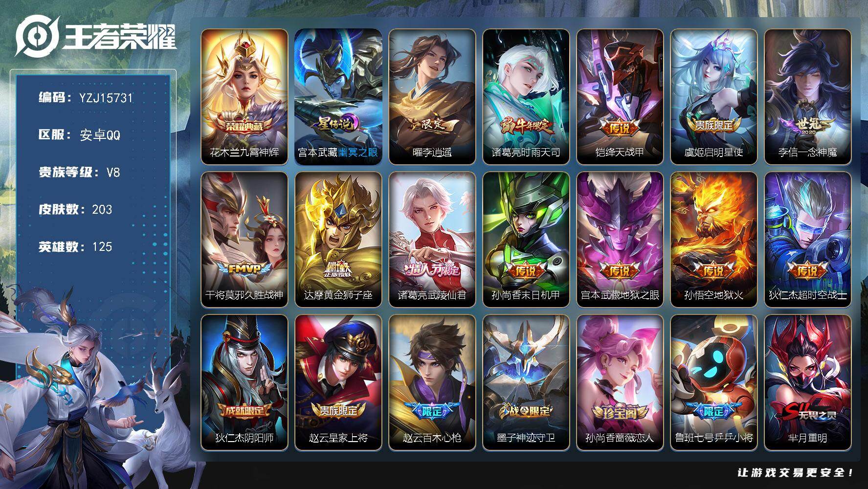 _??可二次,安卓Q-V8(连体和平小号1稀有2粉装8热门,卤蛋头,铁甲悍将)203皮肤1典藏12传说1星元,【典藏】,九霄神辉,【星元】,幽冥之眼,【传说】,启明星使,时雨天司,李逍遥,武陵仙君,绛天战甲,地狱火,久胜战神,一念神魔,黄金狮子座,超时空战士男,地狱之眼,末日机甲女,【热门】万灵启世,巫礼祀神,至尊宝,冰封战神,时雨天司,御风骁将,岱宗,飞衡,烈魂,后羿如梦令,默契交锋女,冰霜恋舞