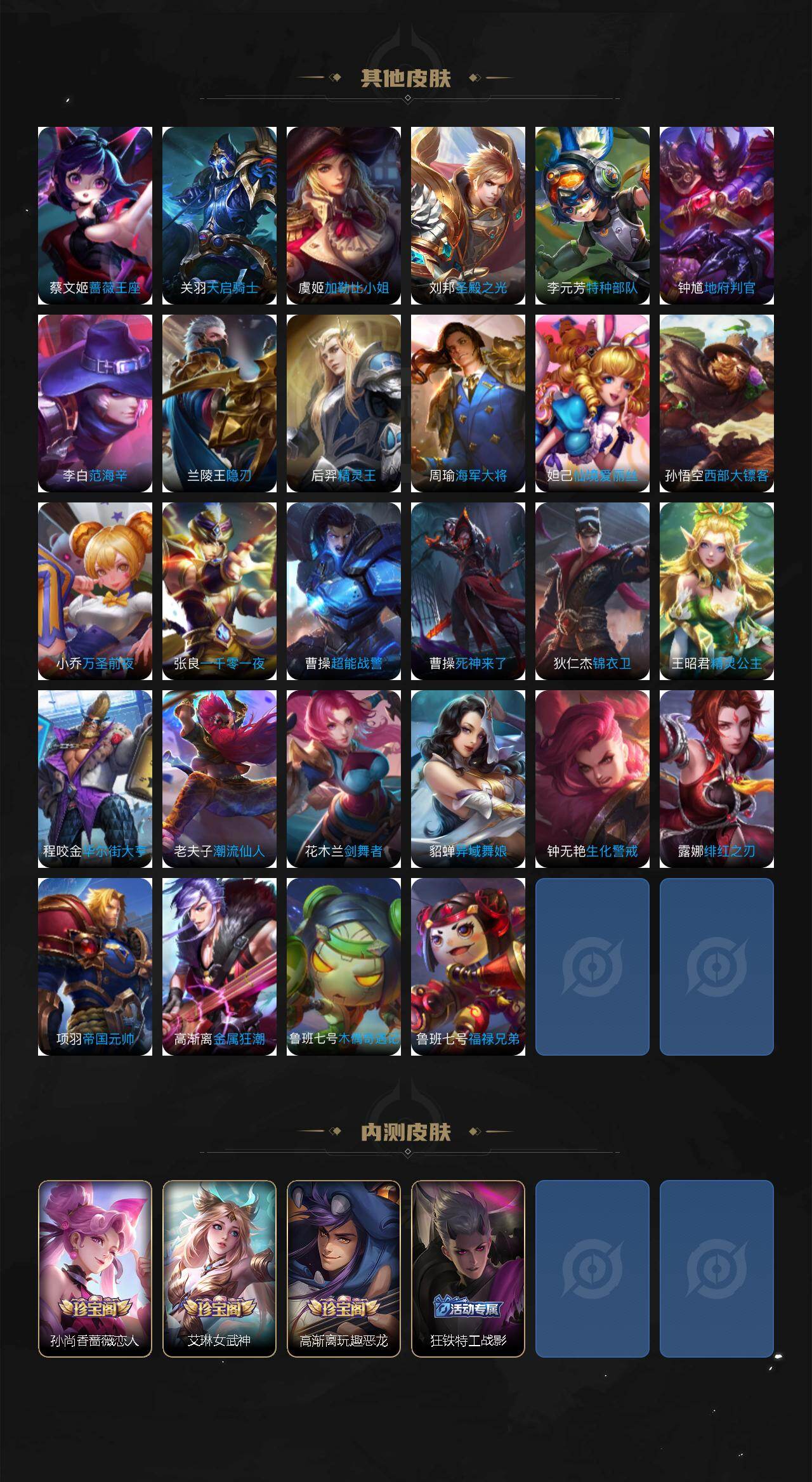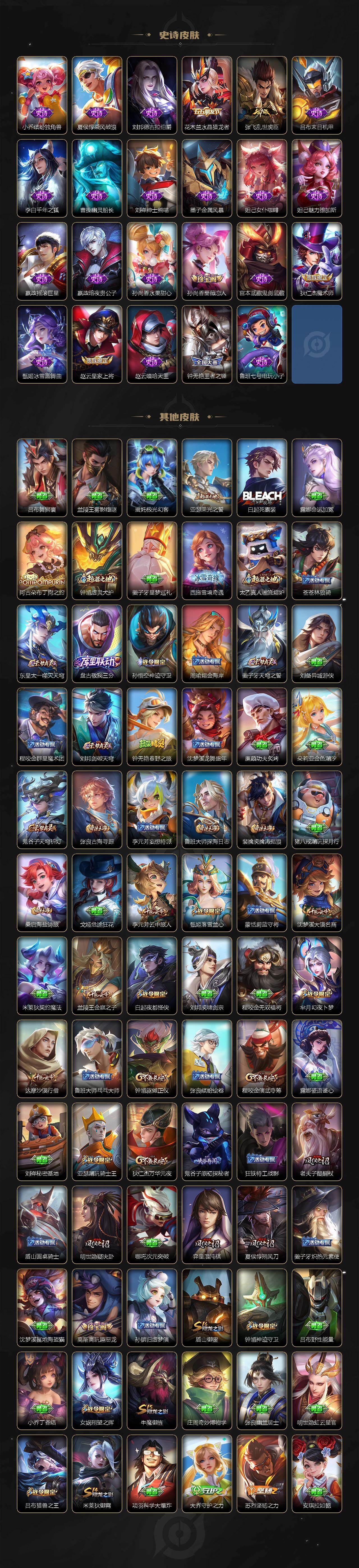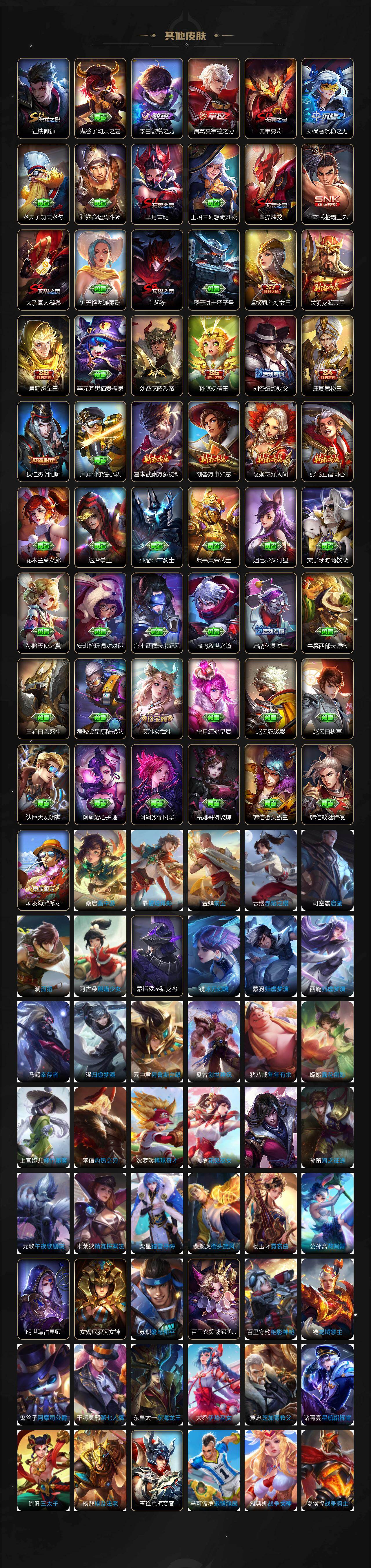 【传说皮肤】:云缨神骥越千峰,狄仁杰神骥赴朔漠,桑启鸣野蒿,典韦战鼓燎原,澜逐花归海,马可波罗妄想实况,诸葛亮鹤羽星尊,后羿无尽星芒,孙策末日机甲,赵云淬星耀世,铠绛天战甲,虞姬启明星使,伽罗太华,后羿黄金射手座,孙尚香末日机甲,宫本武藏地狱之眼,孙悟空地狱火
