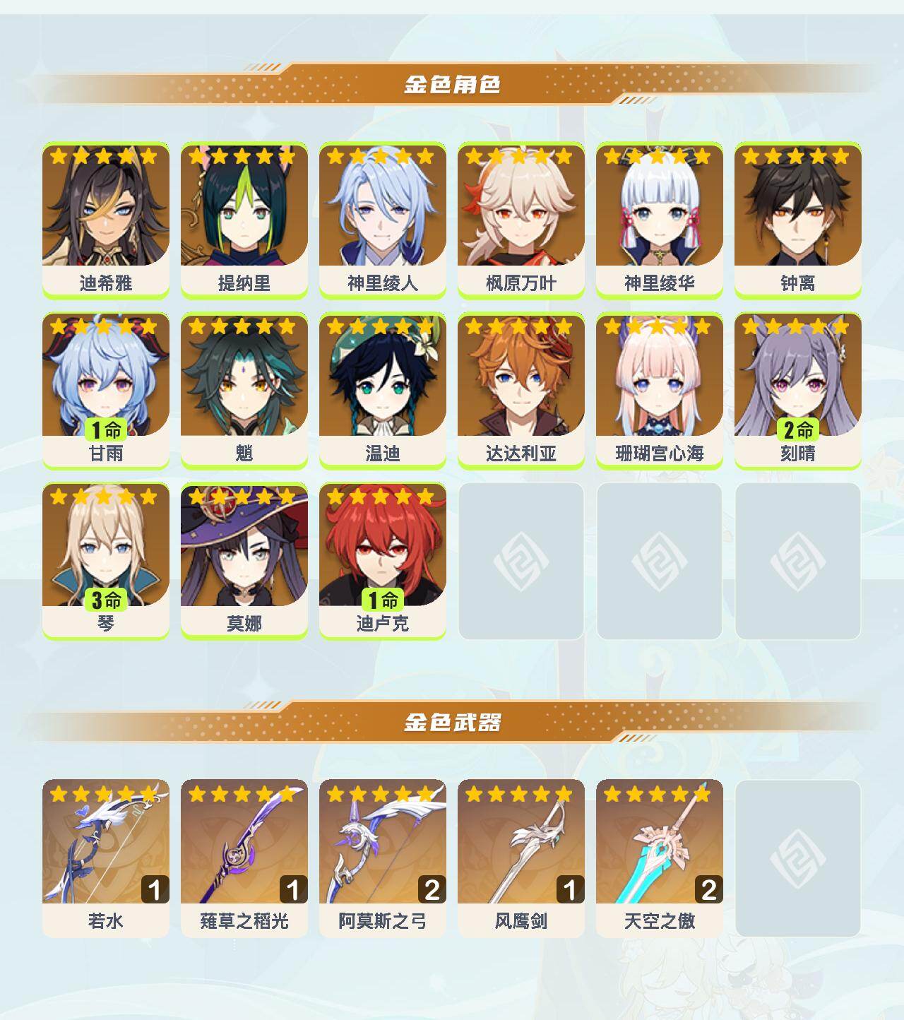 【YS1507】58级/29黄/女主/15个五星角色/5个五星武器/莫娜/温迪/1命甘雨/枫原万叶/魈/3命琴/神里绫华/神里绫人/达达利亚/1命迪卢克/珊瑚宫心海/2命刻晴/迪希雅/提纳里/钟离/若水/精2阿莫斯之弓/薙草之稻光/精2天空之傲/风鹰剑
