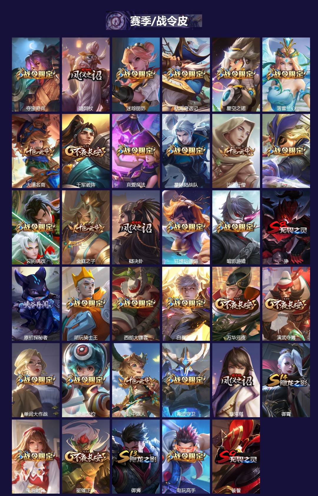 【传说皮】李逍遥,遇见胡旋,游龙清影(小青龙),仲夏夜之梦(大飞蛾),海洋之心,一念神魔,猫影幻舞,无双飞将,音你心动-小乔,胖达荣荣,乞巧织情,挚爱花嫁,音你闪耀(rap皮)