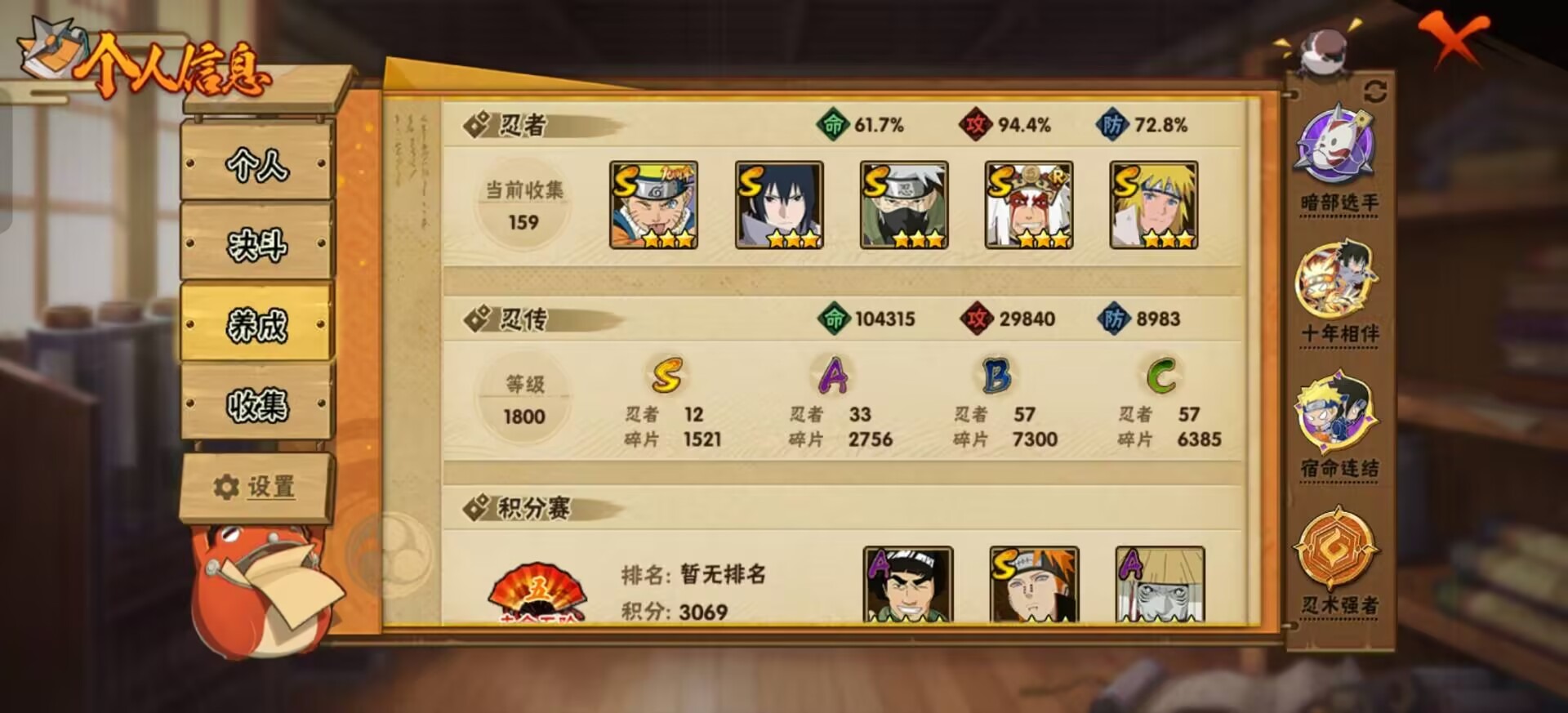 【S级忍者】宇智波斑「秽土转生·解」,宇智波佐助「永恒万花筒」,自来也 「舞之豪杰」,旗木卡卡西「须佐能乎」,波风水门「九喇嘛连结」,漩涡鸣人·宇智波佐助,宇智波带土「十尾人柱力」,宇智波斑「白面具」,猿飞日斩「秽土转生」,宇智波鼬 「须佐能乎」,佩恩「天道」,波风水门