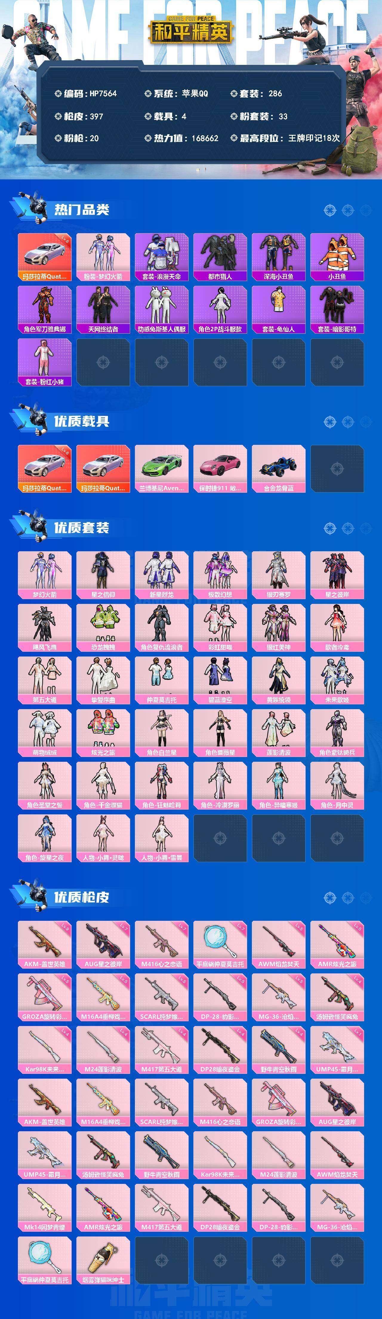 (33粉套20粉枪4载具)地铁满天赋/玛莎拉蒂幻星粉6级/都市/天网/梦幻火箭/星之信仰/新星烈龙/极致幻想/银刃赛罗/星之彼岸/飓风飞鹰/彩虹甜喵/银红美神/歌者泠鸢/第五大道/挚爱序曲/仲夏莫吉托/碧蓝澄空/黄族统领/未来歌姬/萌物绒绒/炫光之旅/白兰星/蔷薇星/莲影清波/圣堂之誓/千金淑猫/狂魅哈莉/冷漠罗丽/异瞳寒姬/月中灵/旋星之夜/小舞·灵珑/小舞·雪昙/没战神框/HP7564-10粉色飞行器-168662热力值-18王牌印记-286套装-397枪皮