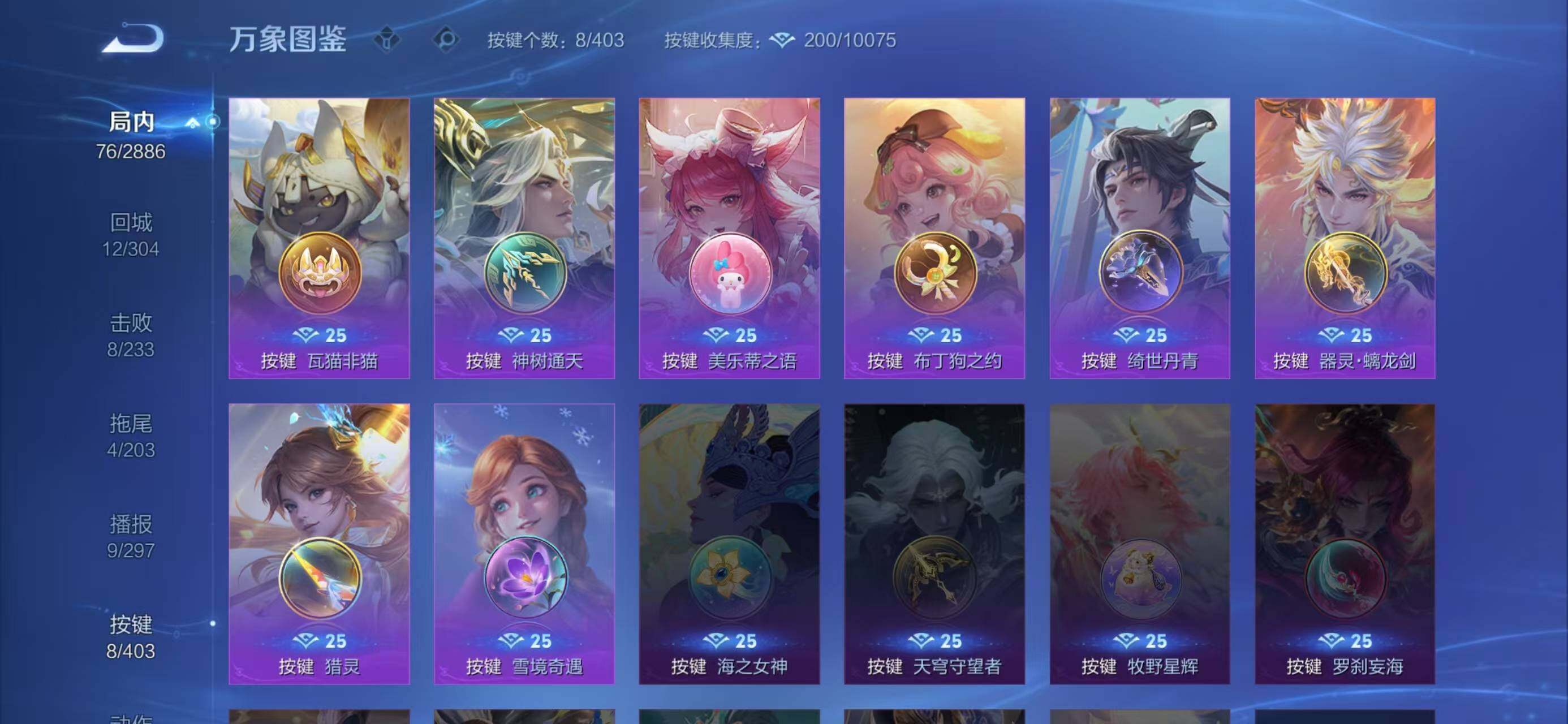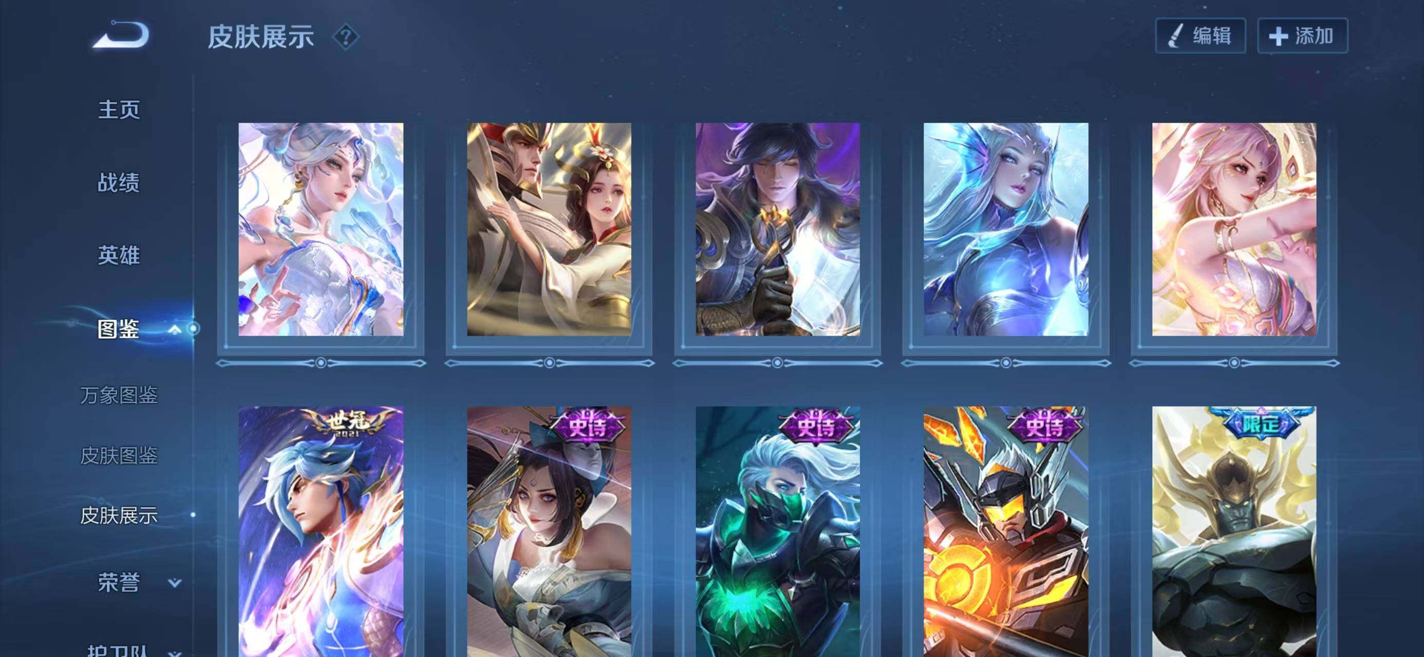 【传说皮肤】:后羿神树通天,女娲愿照千秋盛,虞姬愿照岁时盈,云缨幻光神枪,上官婉儿妄想奇谈,赵云淬星耀世,李信一念神魔,干将莫邪久胜战神,武则天海洋之心