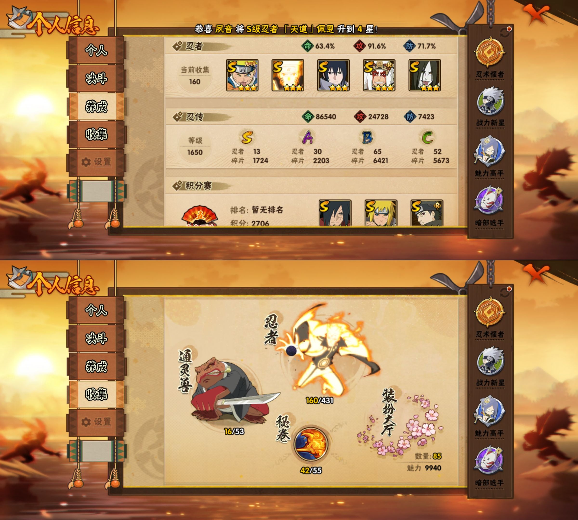 WLHY598安卓Q【区服】1878【等级】145【S级数量】13【A级数量】30【B级数量】65【C级数量】52【S级】宇智波斑「秽土转生·解」 大蛇丸 波风水门「秽土转生」 漩涡鸣人「九喇嘛连结」 宇智波鼬「须佐能乎」 宇智波止水「须佐能乎」 宇智波佐助「永恒万花筒」 佩恩「天道」 长门「秽土转生」 自来也「舞之豪杰」 艾「忍界大战」 波风水门 漩涡鸣人·宇智波佐助