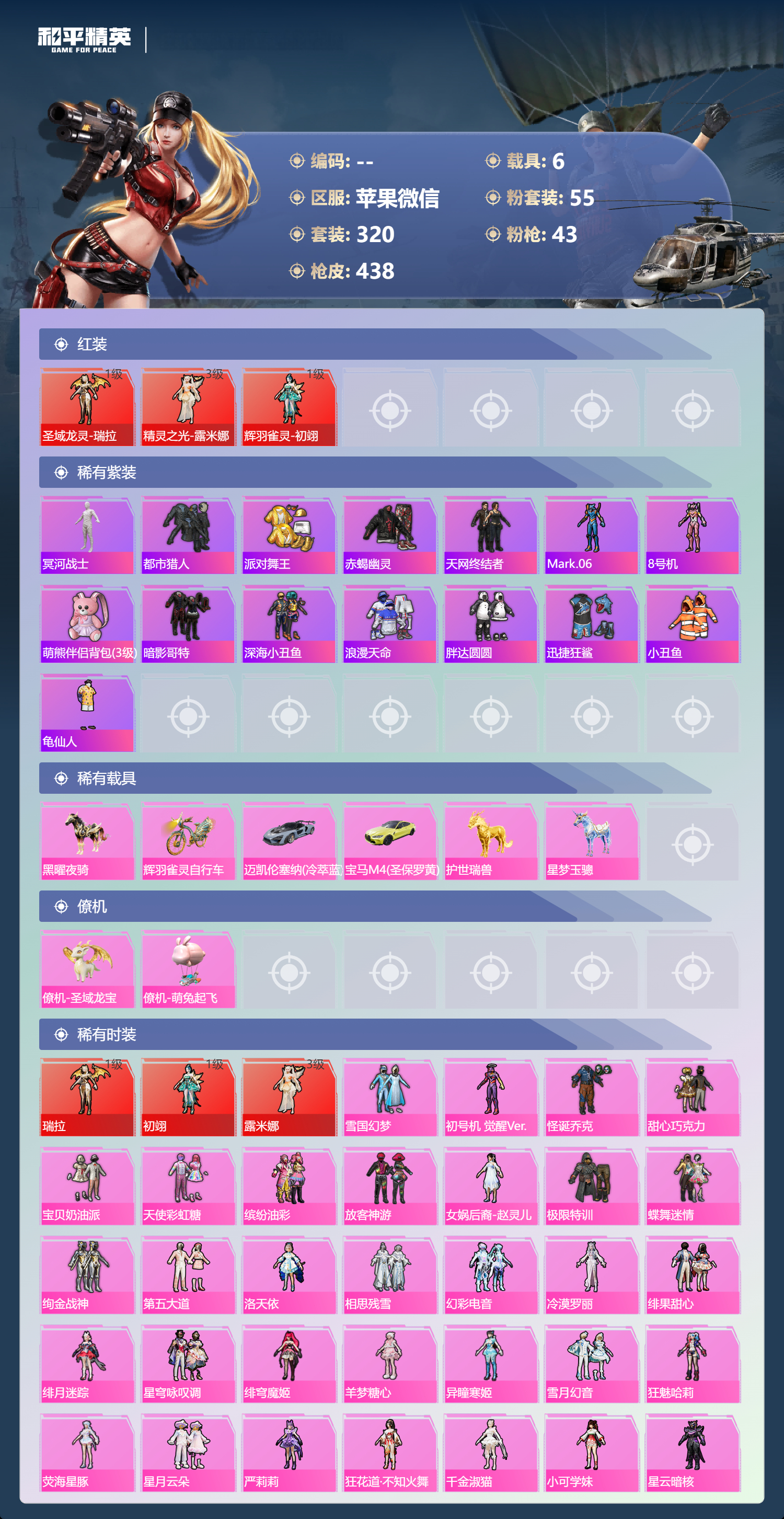 【三红装小丑雪国白木乃伊天网满级星梦】苹果微信-12王牌印记-有战神框-3红装-