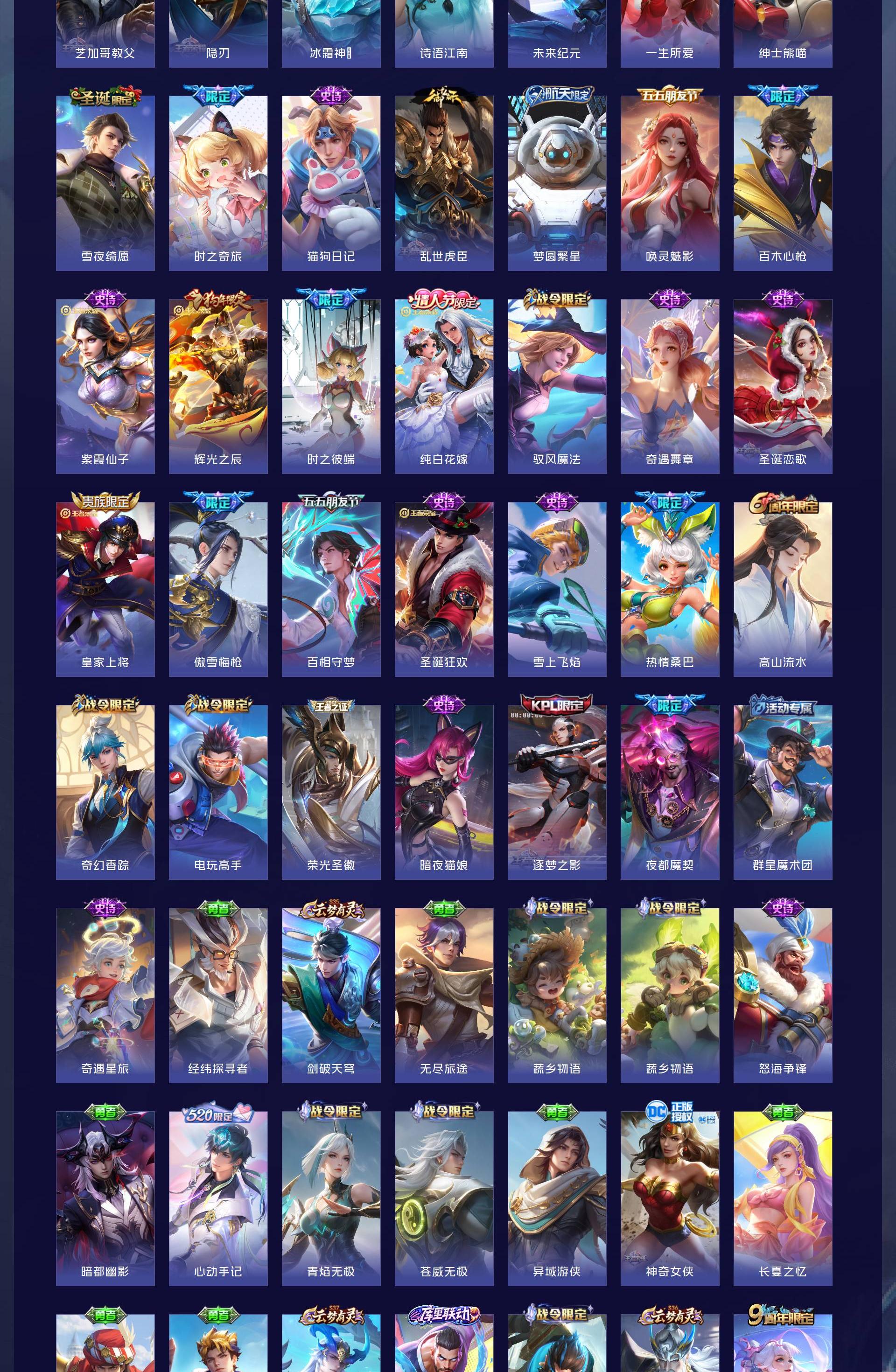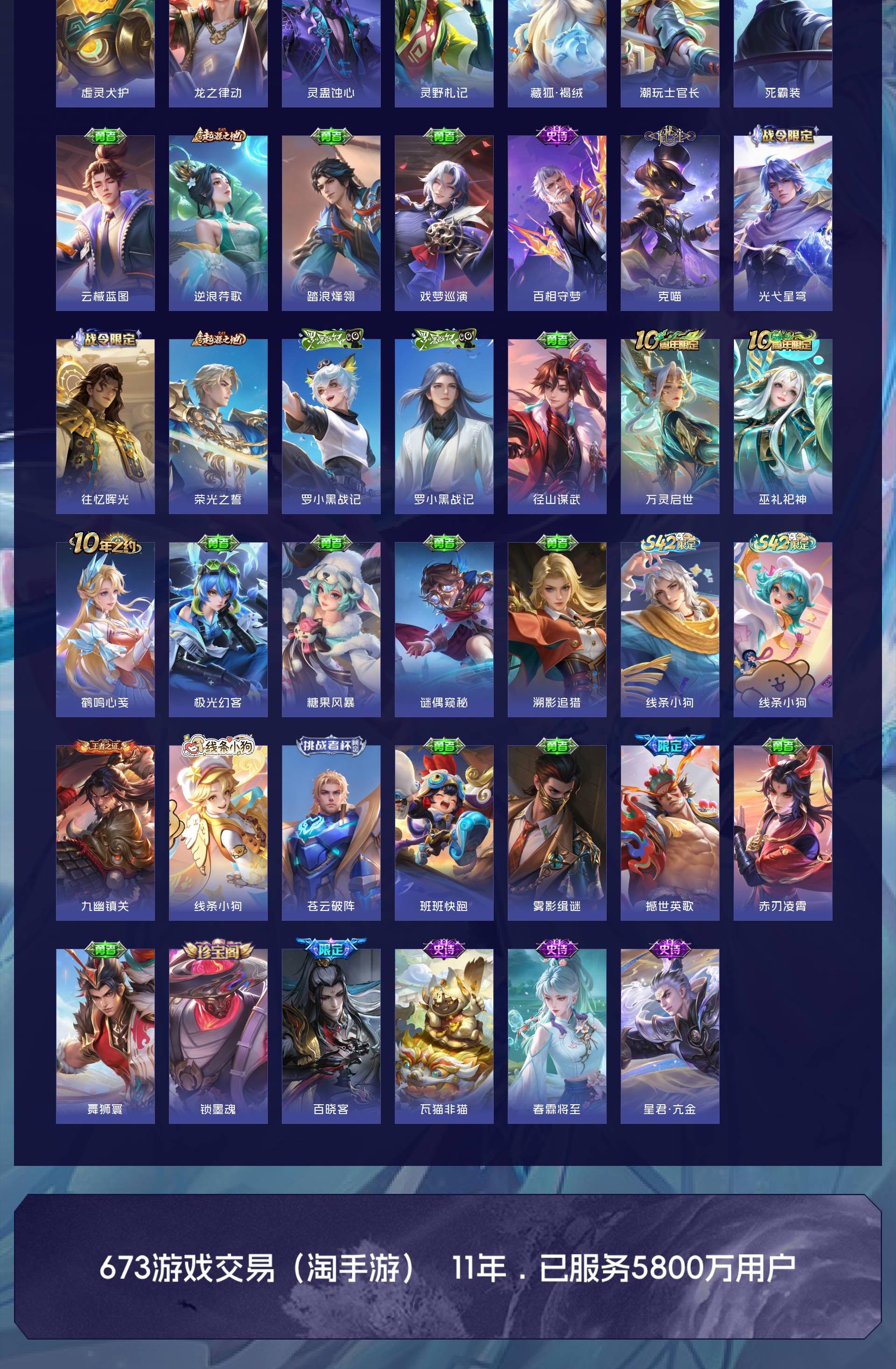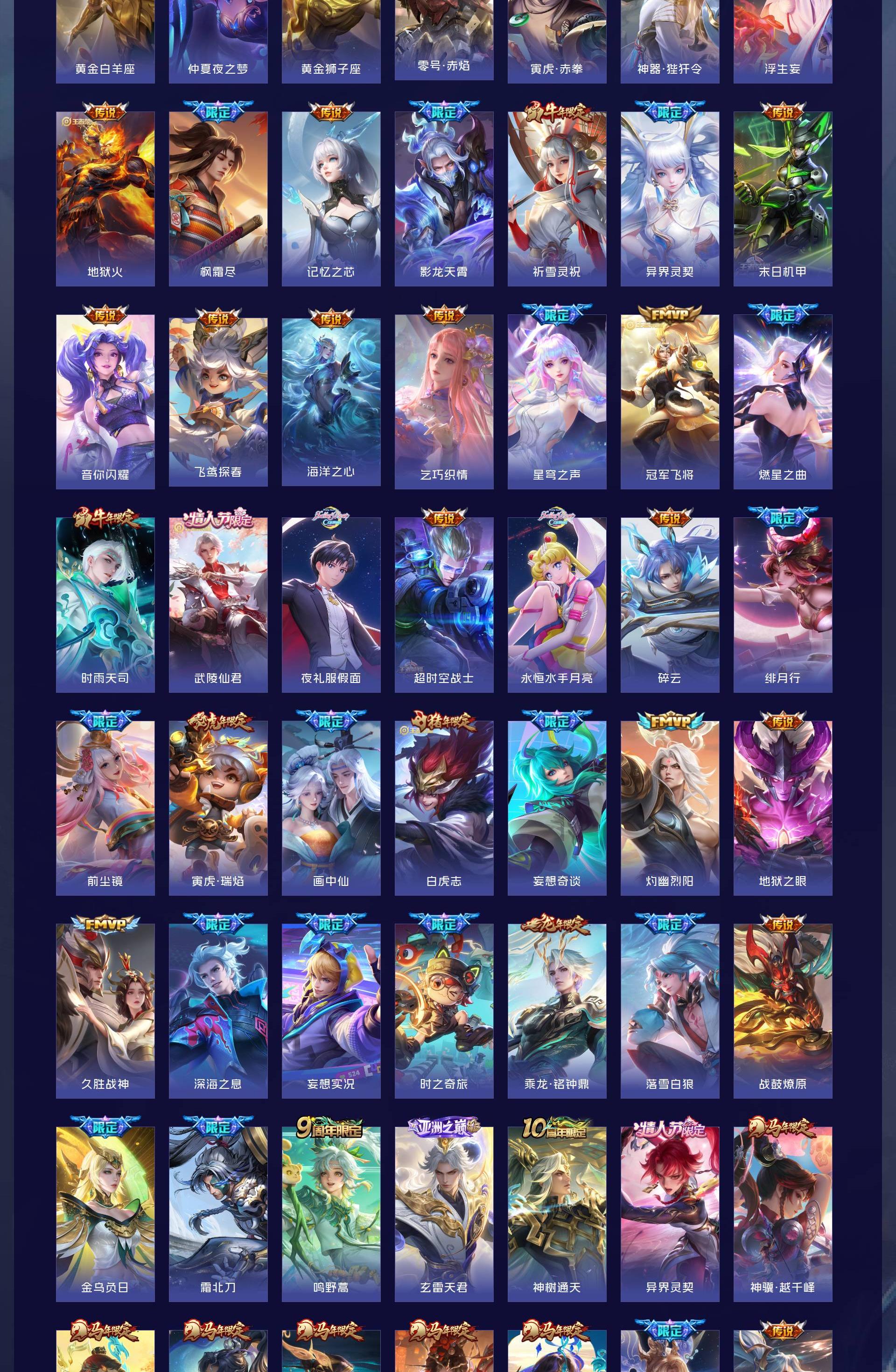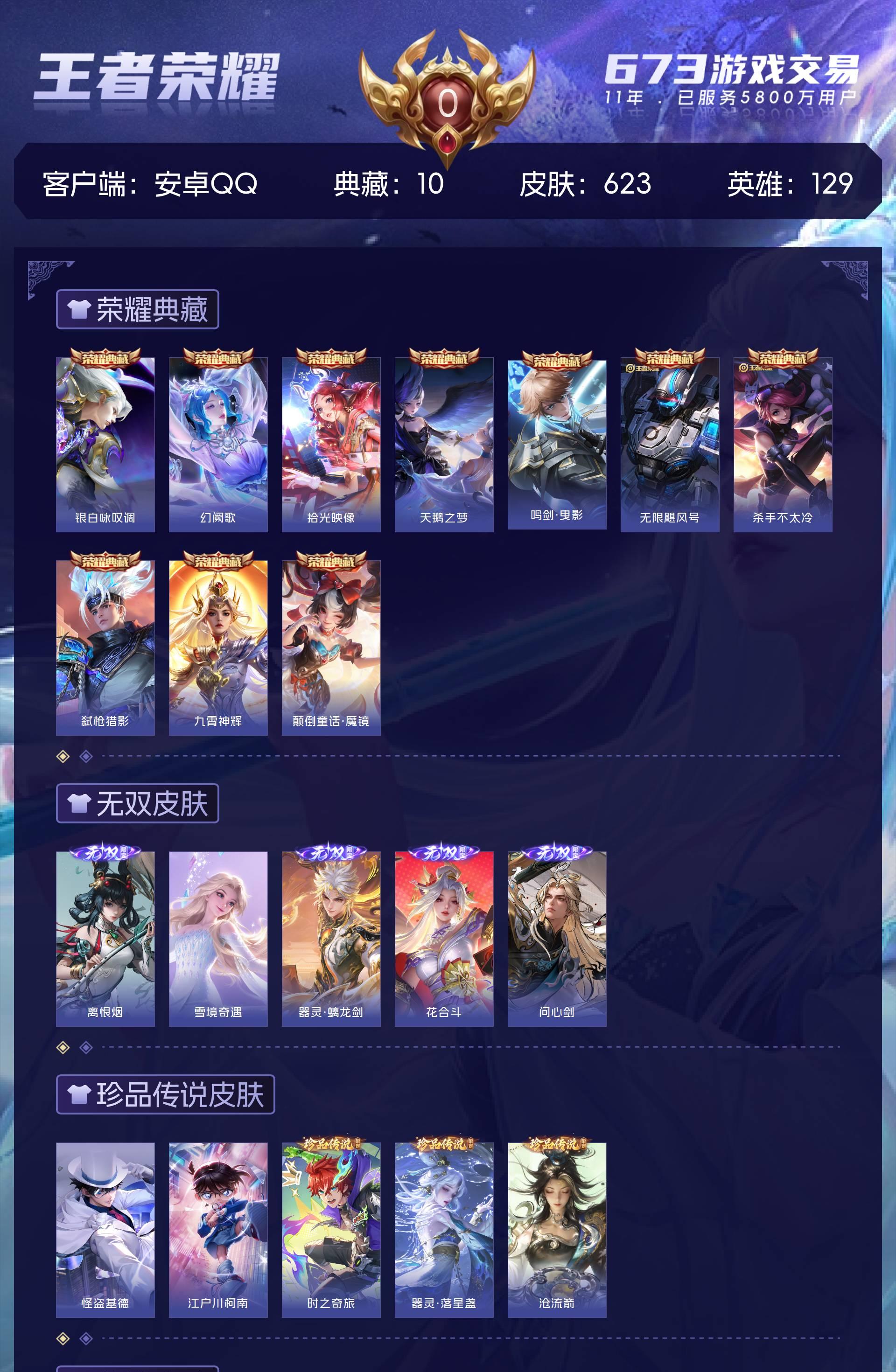 皮肤623 英雄129 永恒钻石 荣耀典藏10 无双皮肤5 珍品传说5 传说99-u绝版皮肤都有,除了梅西