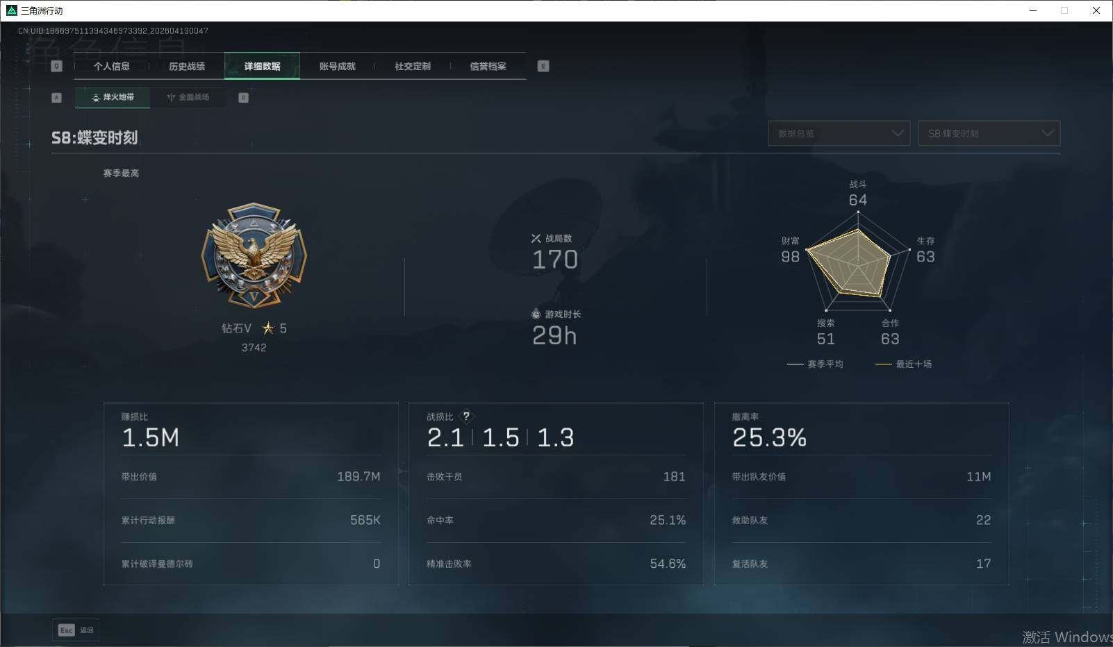 34m总资产-66k哈夫币-60烽火等级-钻石-21战场等级-列兵