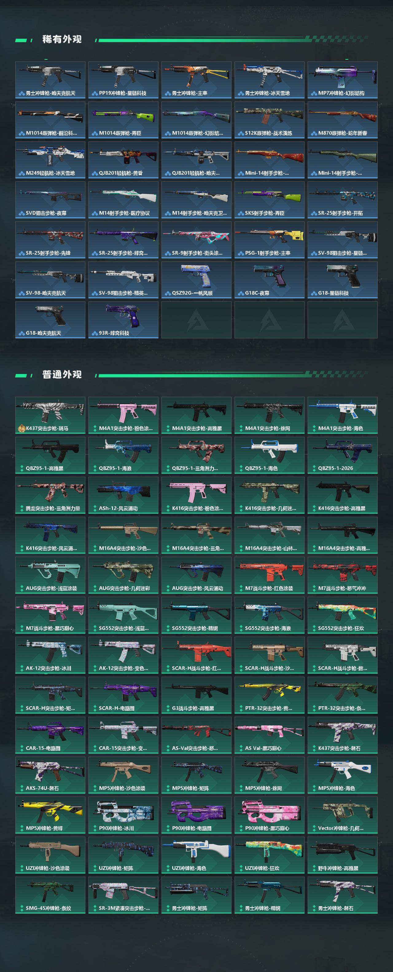 【传说外观】:M4A1突击步枪-蚀金玫瑰,M4A1突击步枪-阿米娅,AKM突击步枪-赤枭,AKM突击步枪-动力风潮,QBZ95-1突击步枪-破军,QBZ95-1突击步枪-凌霄戍卫,ASh-